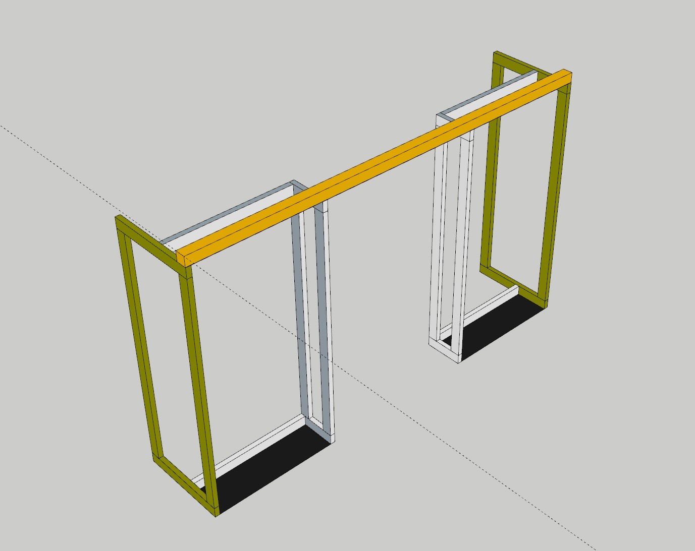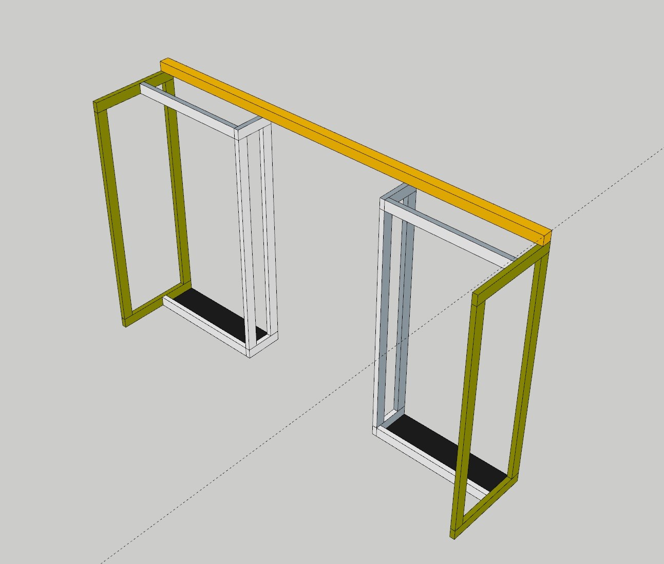 Upphängningssystemet/skenan till den utanpåliggande skjutdörren (ej inritat i skisserna) har jag tänkt fästa i en 90x90 Limträbalk som löper ovan bokhyllorna. För att "hålla uppe" limträbalken har jag tänkt bygga ett ramverk av reglar. V.g. se bild 3 (snett framifrån) och bild 4 (snett bakifrån). Limträbalken (90x90) är den gula, de gröna reglarna (95x45) planerar jag att skruva fast i regelverket i intilliggande väggar, medan de vita reglarna (95x45) är "fristående". Bokhyllorna kommer att ställas/byggas in på de svarta ytorna.