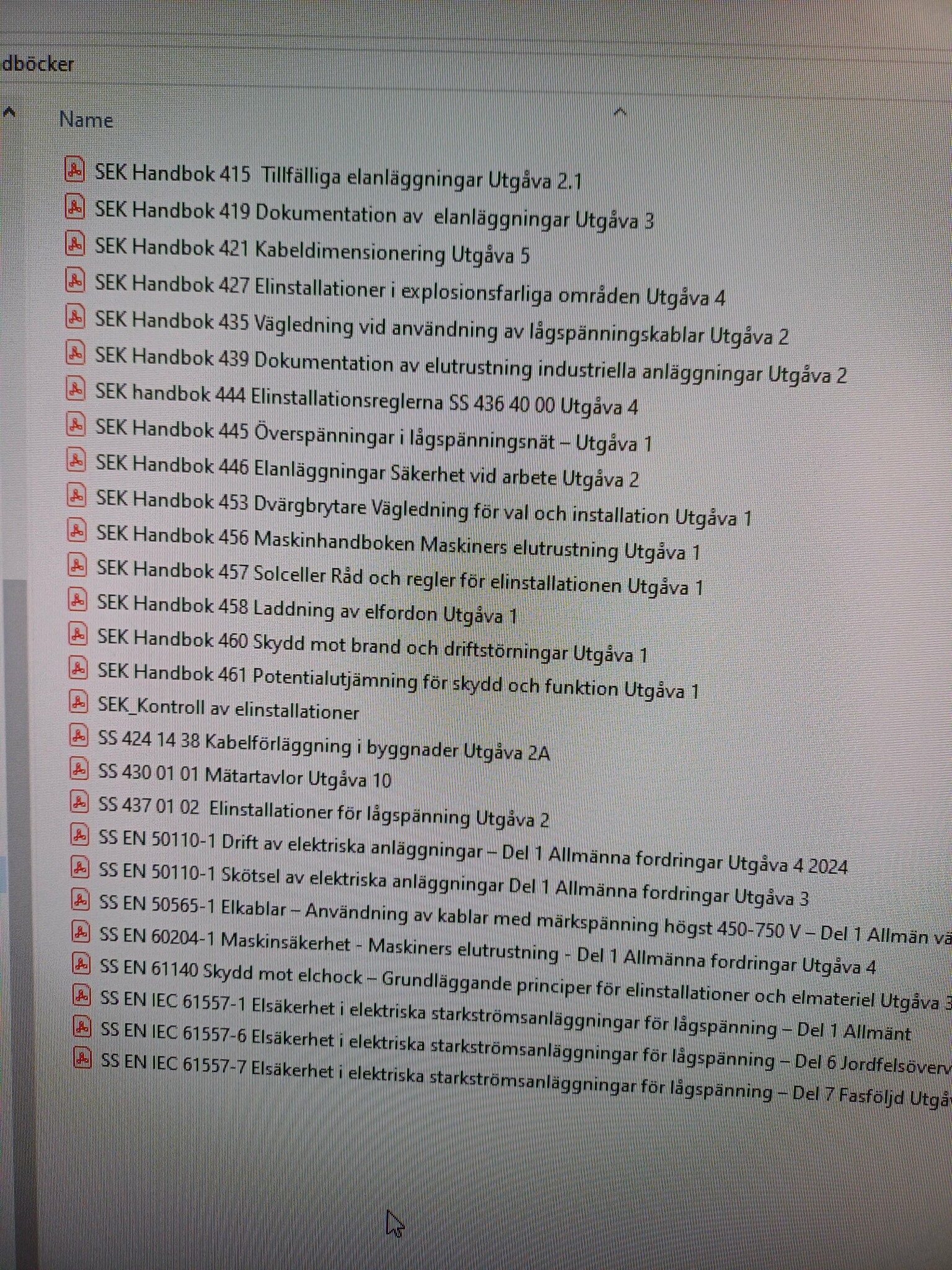 Klassisk härskarteknik. Det imponerar lika lite som din signatur. De flesta av de där filerna har ingen bäring på det som diskuteras. Eller har du en annan uppfattning om t.ex. SS 430 01 01, som handlar om mätartavlor? Eller SEK HB 421 Kabeldimensionering?