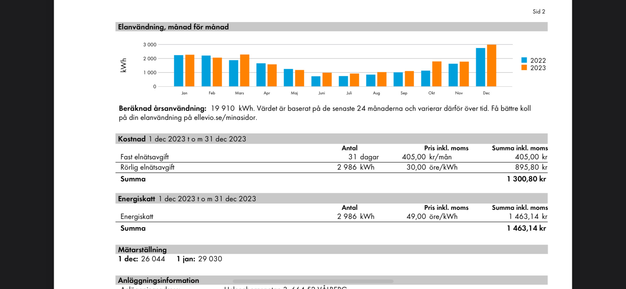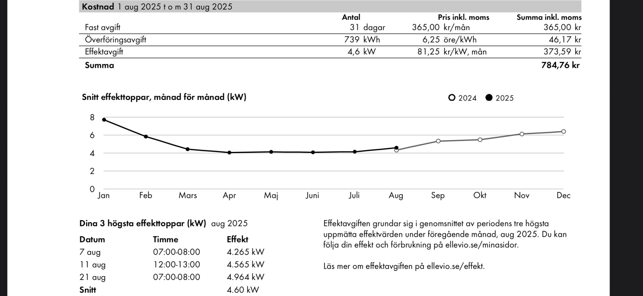 Lägger till en bild på 2024 års elnätskostnad, förbrukade lite mer energi. Men siffrorna finns i fakturan, så kostnaden blev betydligt lägre 2025, trotts den hemska effekttsriffen [bild]