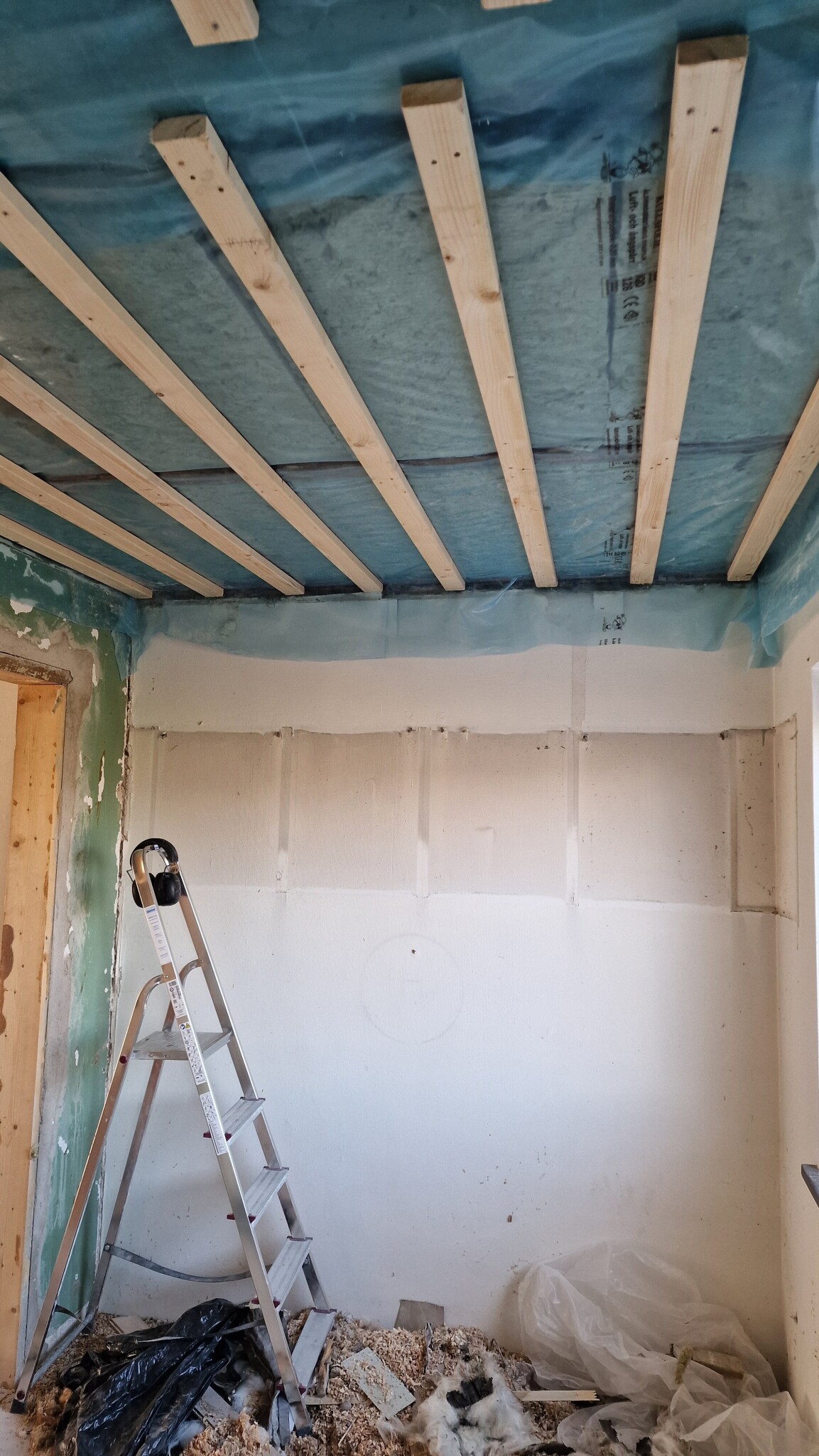 Har lagt ny isolering på kattvind ovanför blivande badrum och arbetsrum. Väggarna i arbetsrummet hade jag eg bara tänkt spackla o måla men nu med isoleringen o byggfolien på plats så blir jag fundersam på hur man snyggast avslutar det här nu då. Någon slags skiva på väggen som klämmer fast platsen bakom verkar lättast, men är det rätt?