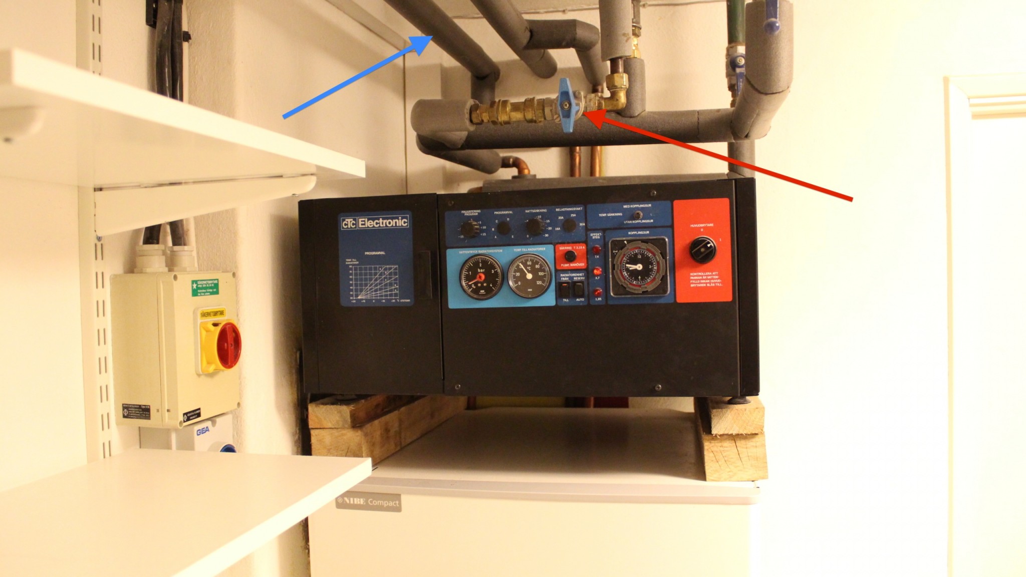 Blå pil är huvudvattenledningen in och röd pil är kranen för att fylla på radiatorsystemet.