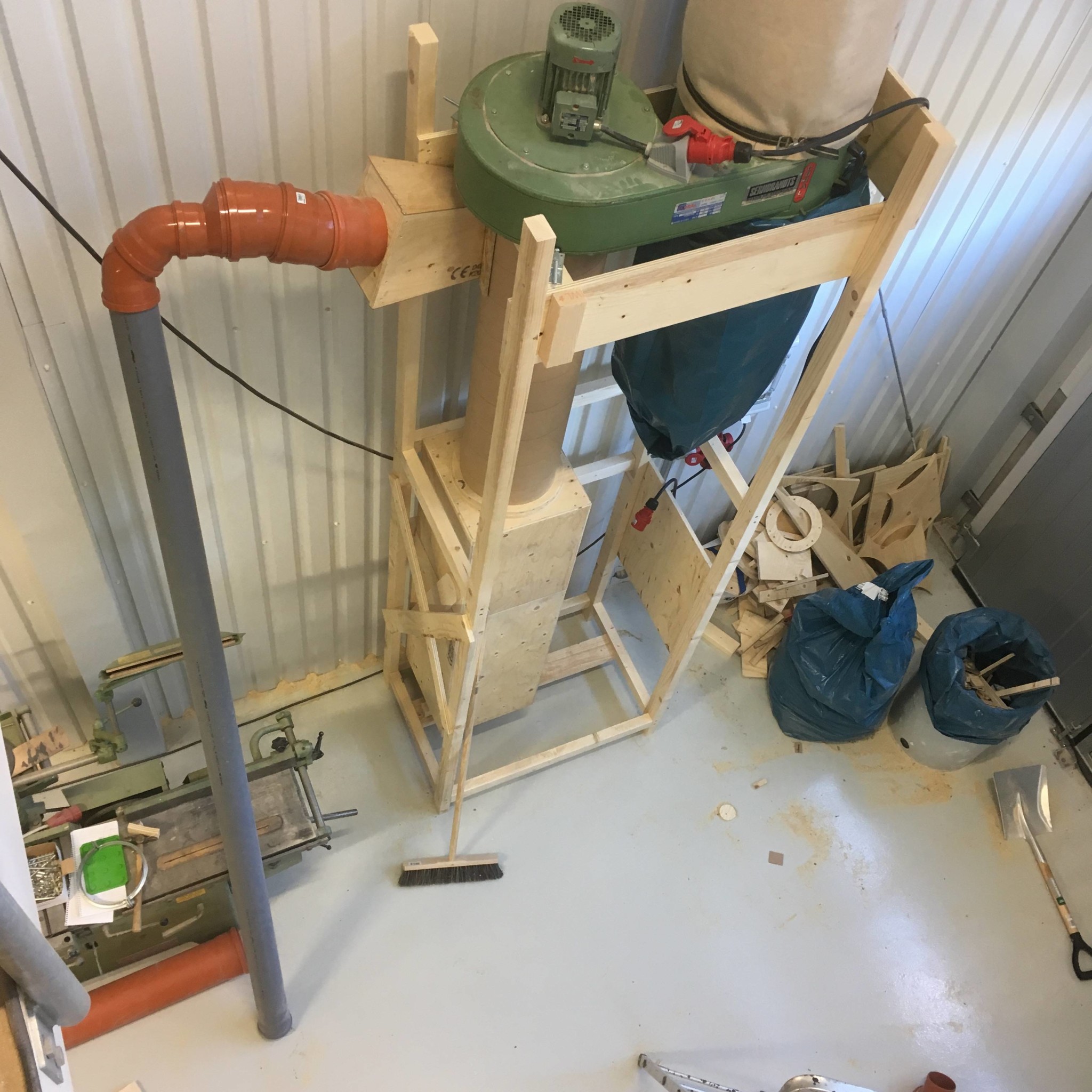 Jag hoppas att det kommer att fungera bra med cyklonen. Om det inte gör det, kan du börja med att flytta inloppet till cyklonen. Som det ser ut nu roterar luften i cyklonen åt ena hållet och fläkten åt andra.