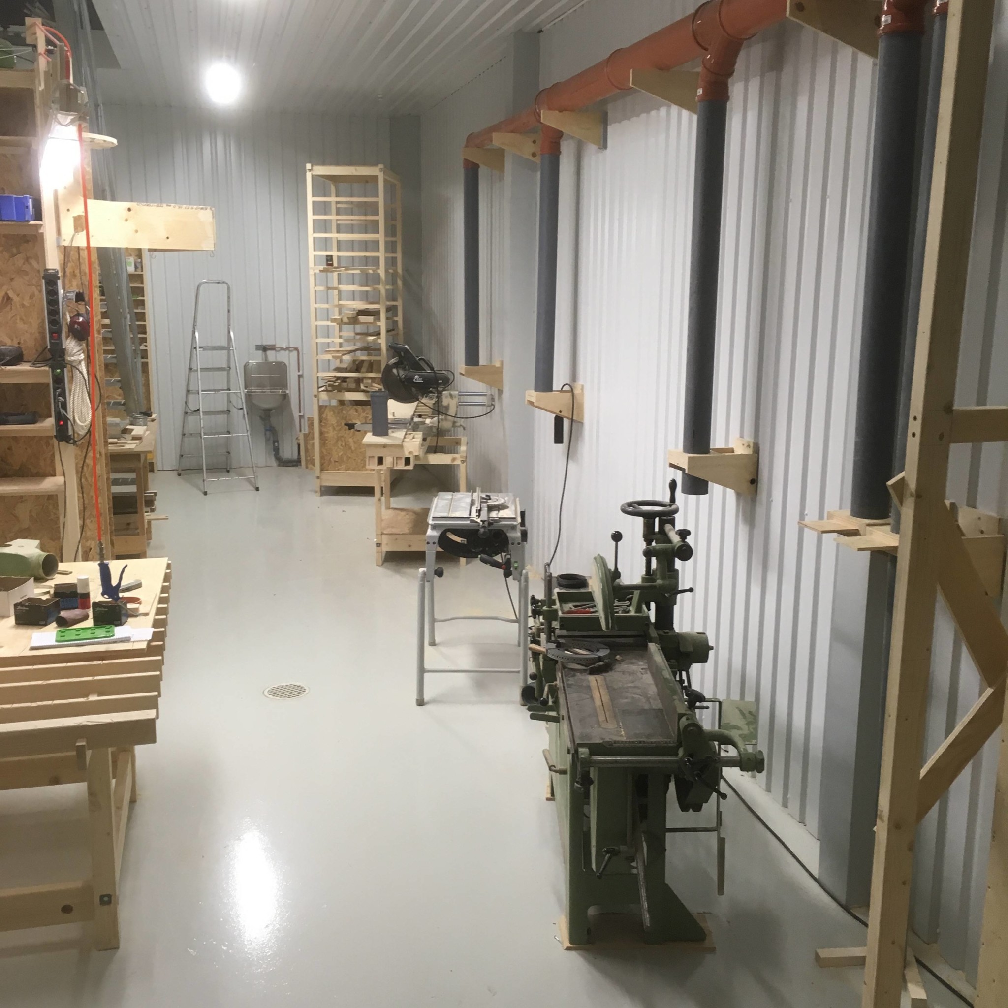 Behöver hitta ett annat hem till borrmaskinen. Utan den i raden kan jag ställa maskiner lite diagonalt efter väggen så att arbetsområden inte överlappar. Dämed kan jag jobba med ca 3 metersbitar utan att möblera om.