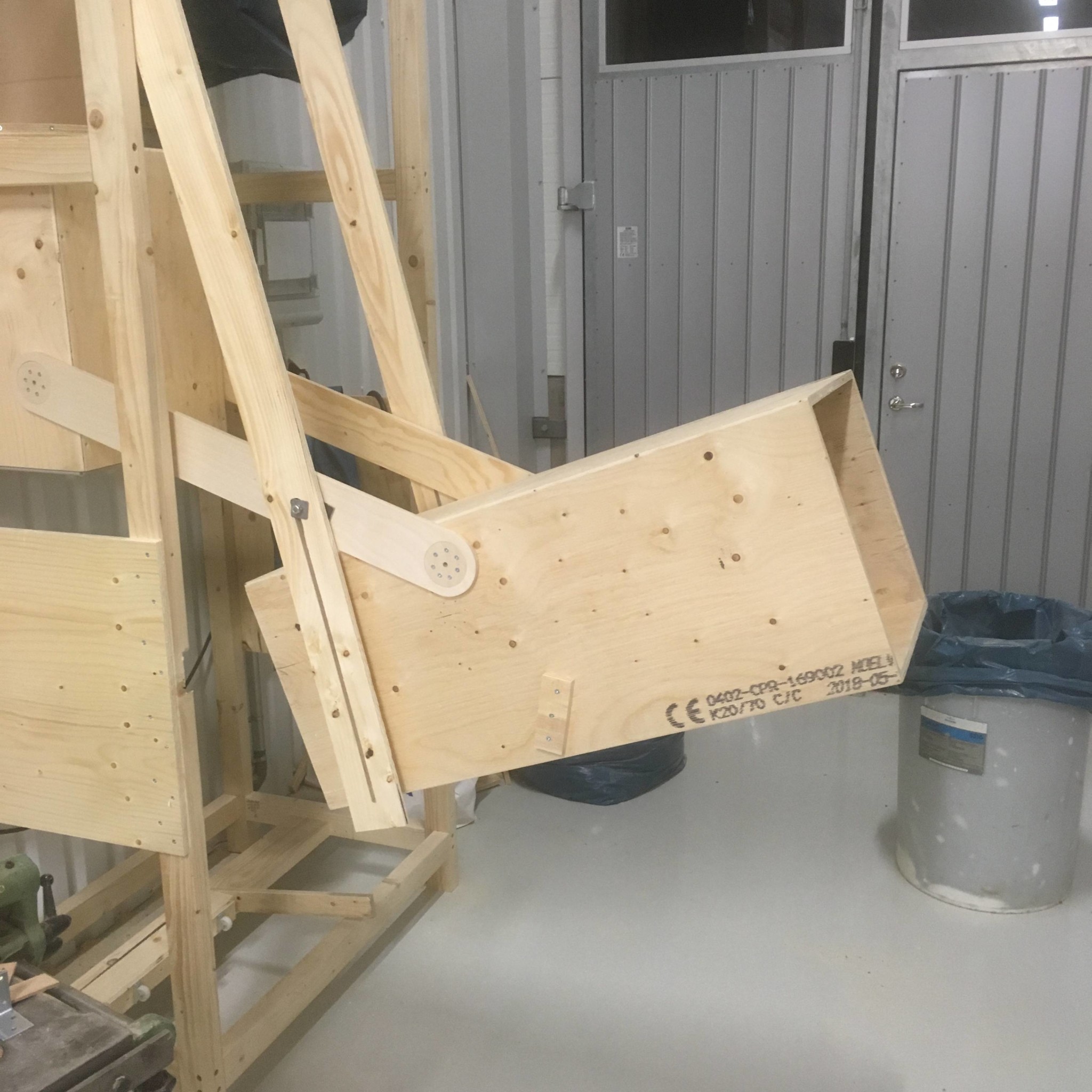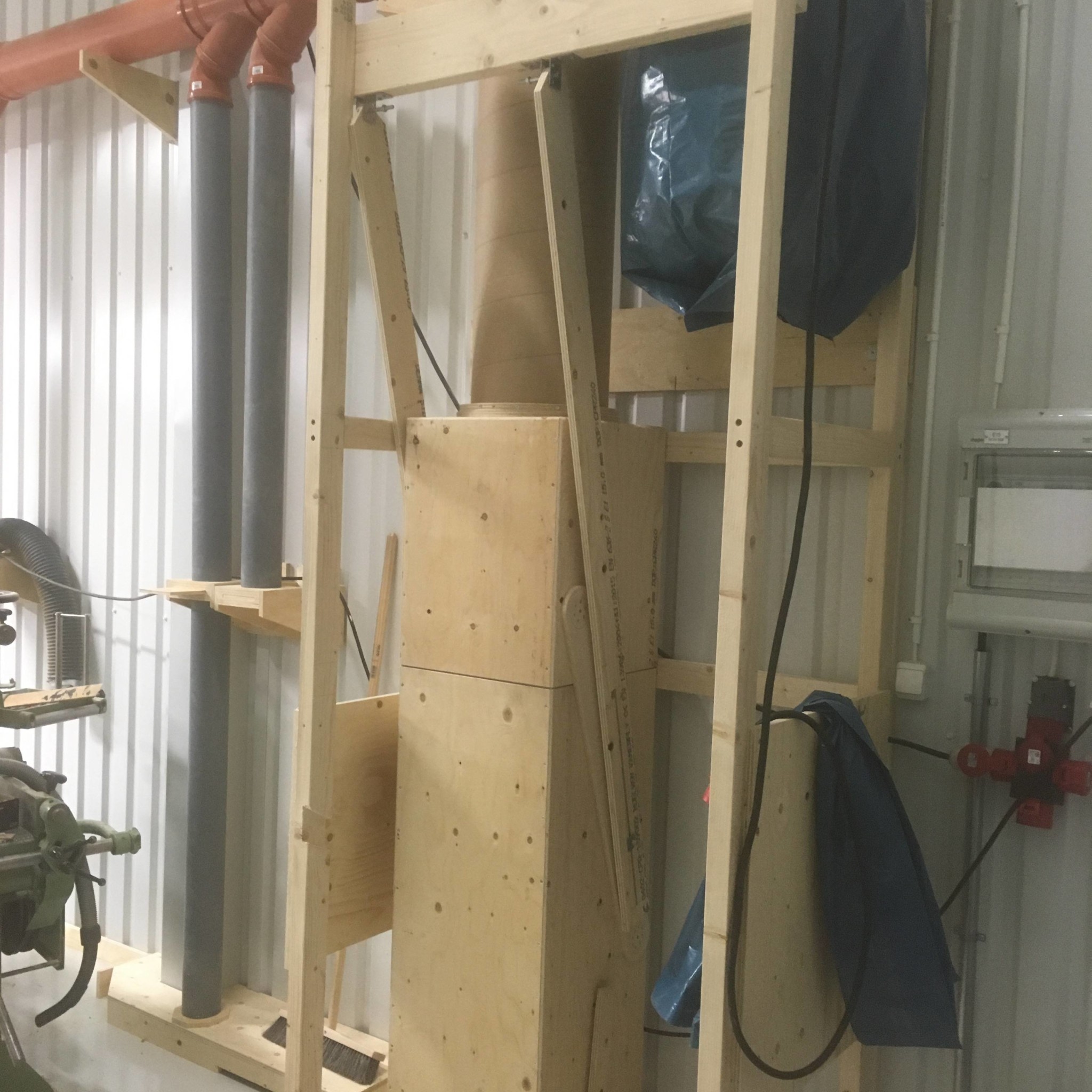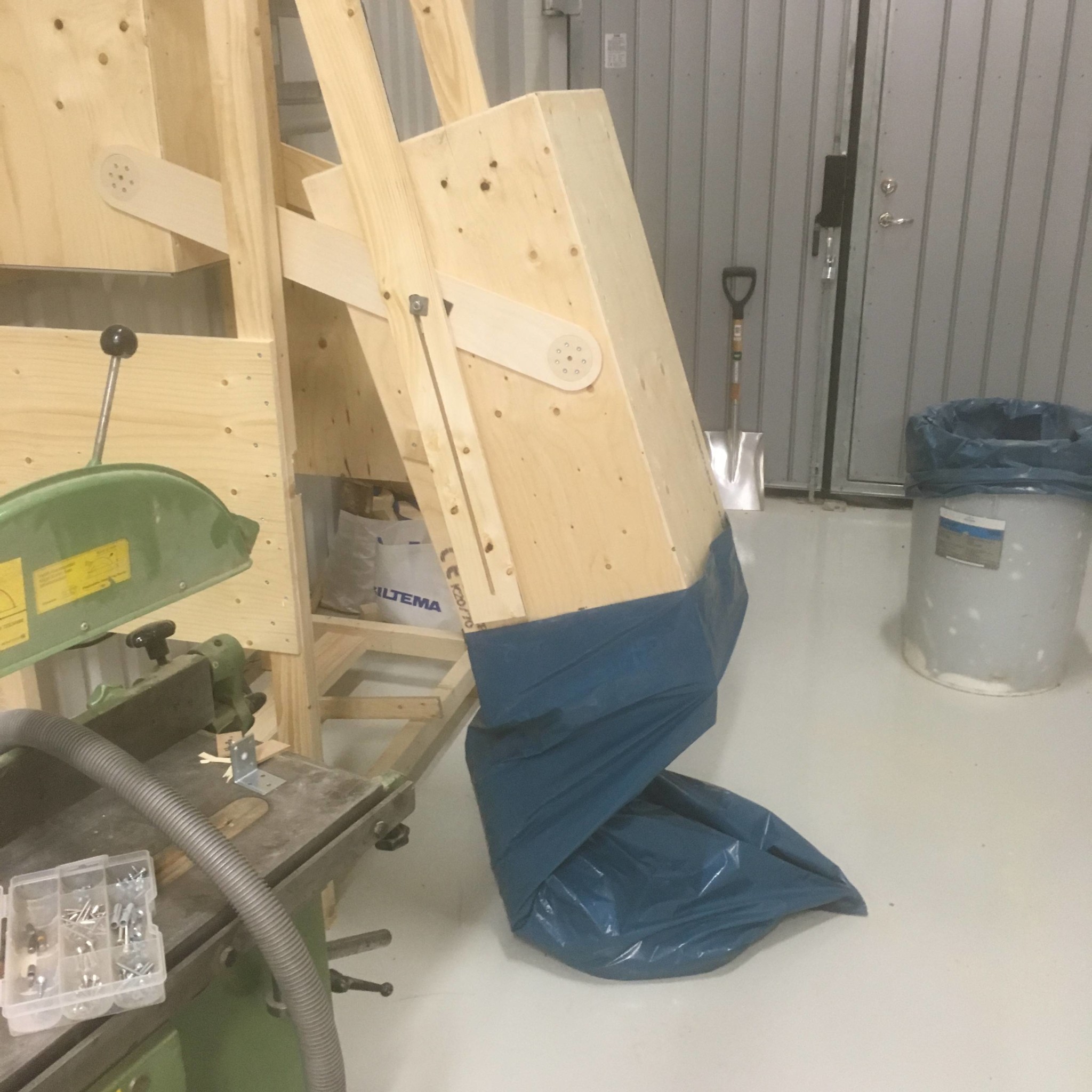 Därför övergav jag tanken på ett torn med lucka och löst kärl inne. Det skulle krävt en lutande sarg för att få allt spån i kärlet. Dubbelt material och mer komplicerat.