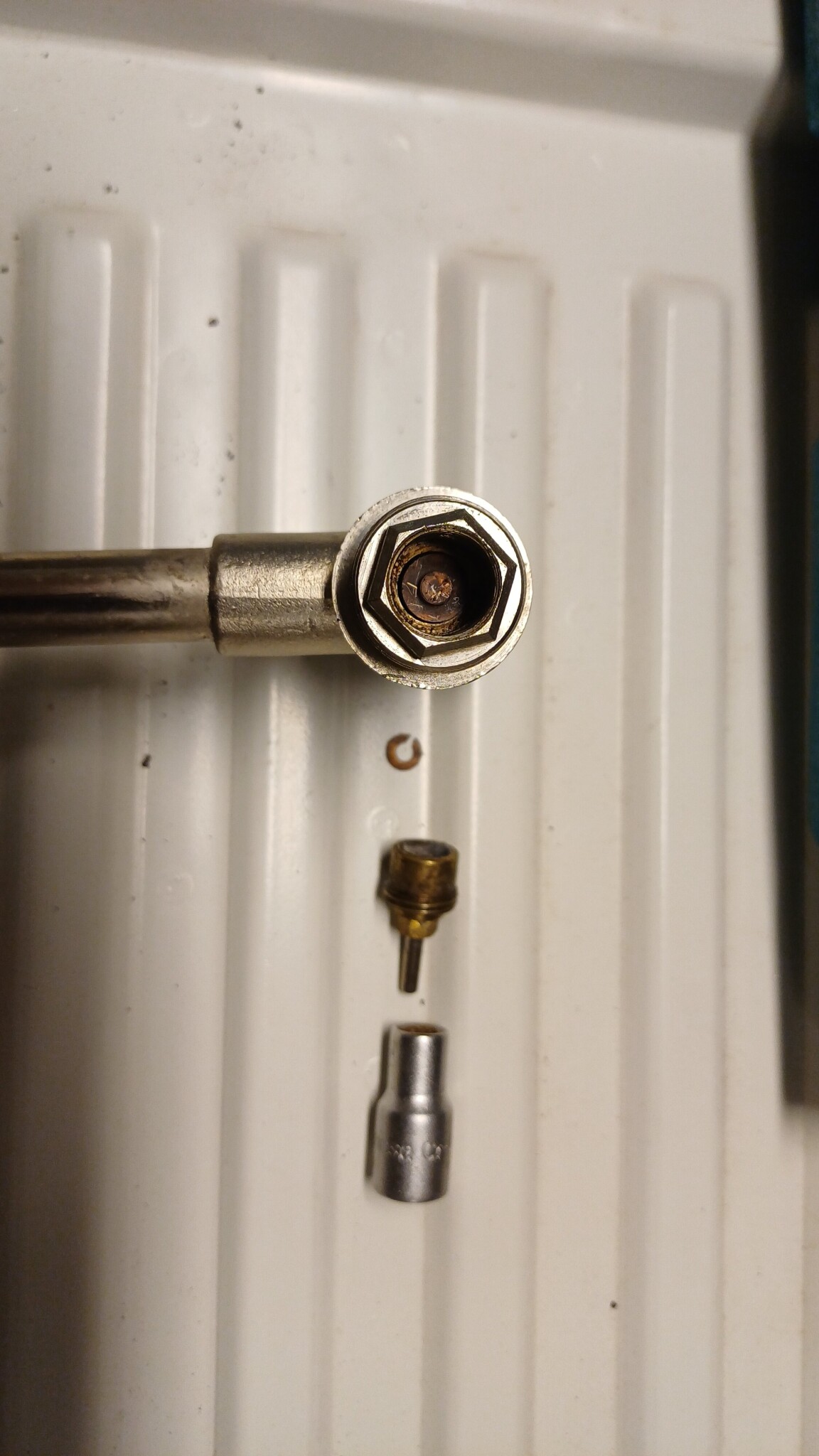 När jag skruvade bort ventilmanövreringen så låg det en liten låsring löst därinne. Den här ventilen känns som att den fungerar men alla gjorde inte det. Vissa ventiler, samtliga termostater och alla slingstrypventiler var kass redan 2005 när vi flyttade in. Hela värmesystemet var från 1981 då huset byggdes. 2023 byttes allt utom 12 mm prisolrören till, från och mellan radiatorerna.