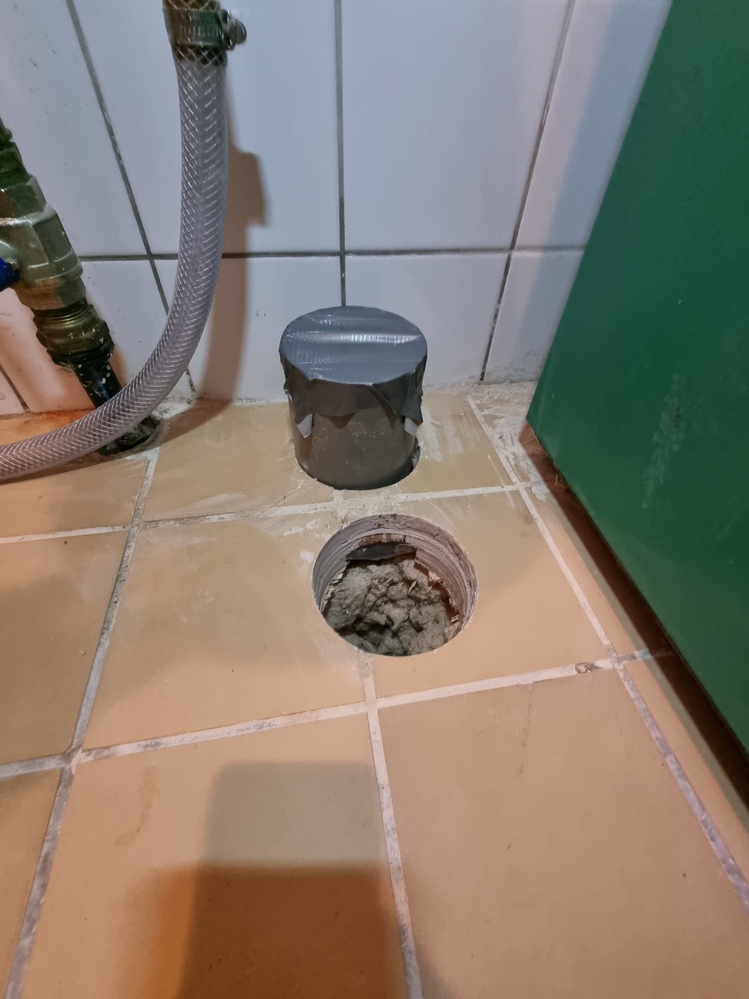 Hur har du tänkt att täta genomföringen i det vattentäta golvet? Stor riskt för vattenskador om golvet vattenbegjuts då mycket vatten även rinner på tätskiktet och inte bara uppe på golvet.