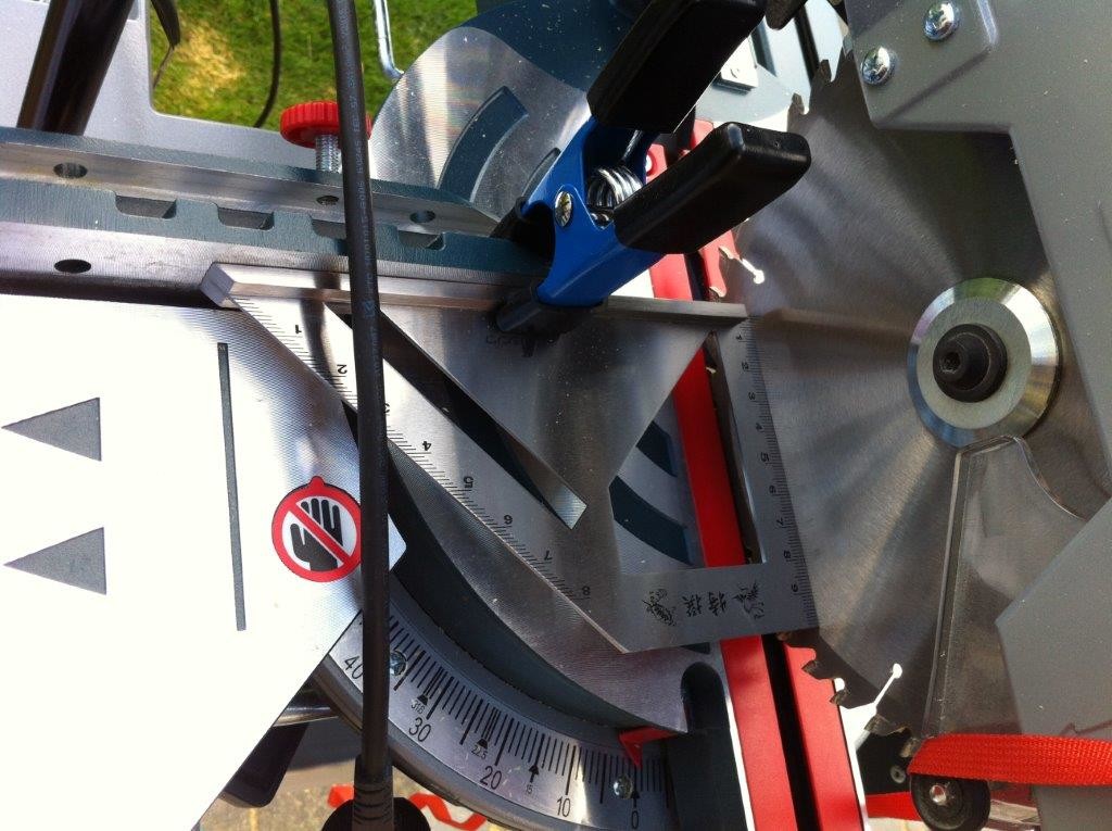 Det går att justera sågen horisontellt. Jag skaffade en vinkelhake med kortare skänkel (100 mm) så att den stöder mot klingans centrum utan att röra vid tänderna. Vinkelhakens fot klämde jag fast mot anhållet.