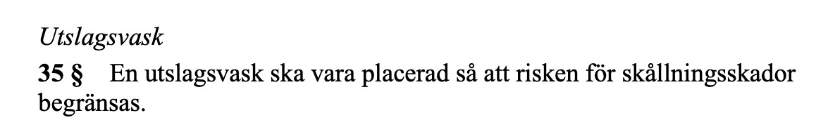 Kravet i avsnitt 8:43 BBR säger att ”Utslagsvask ska placeras så att risken för skållningsskador begränsas”. Det är alltså ett krav som måste följas. Till detta krav finns ett allmänt råd som säger att ”Utslagsvask bör placeras i samma inredningslängd som spisen”.