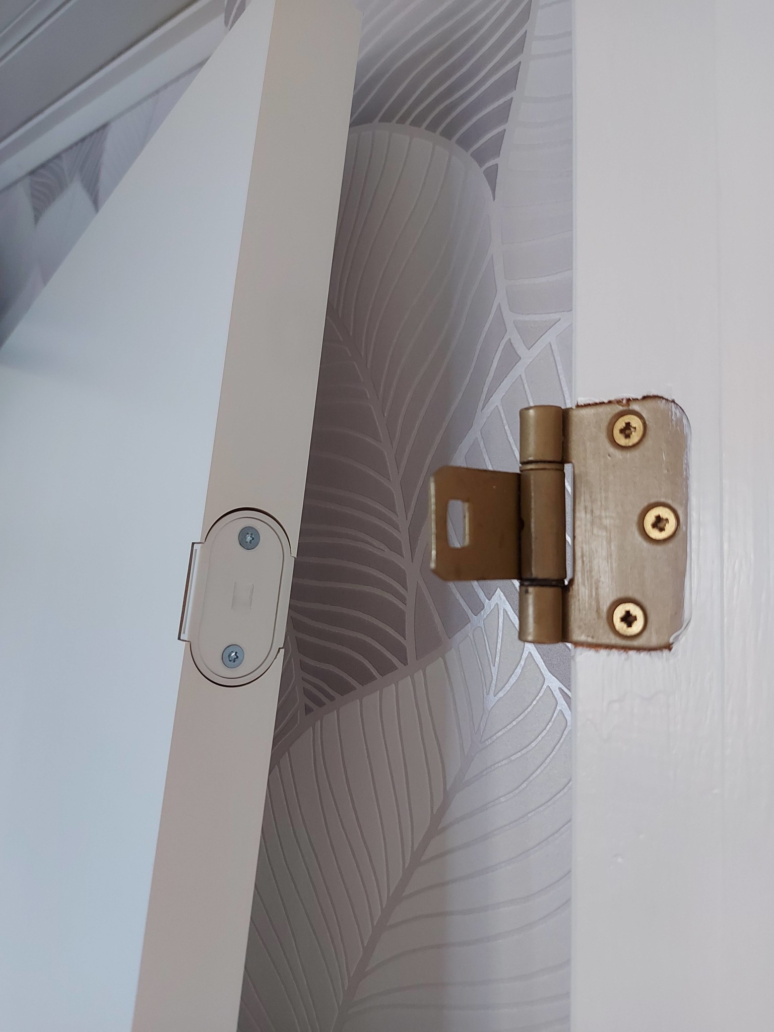 Så nu hoppas vi på svar från någon kunnig här i forumet. Finns det flera olika sorters snap in-gångjärn? Eller handlar det om att våld löser problemet och vi kan banka in den? Eller måste vi köpa någon ny variant och skruva fast i dörrkarmen?