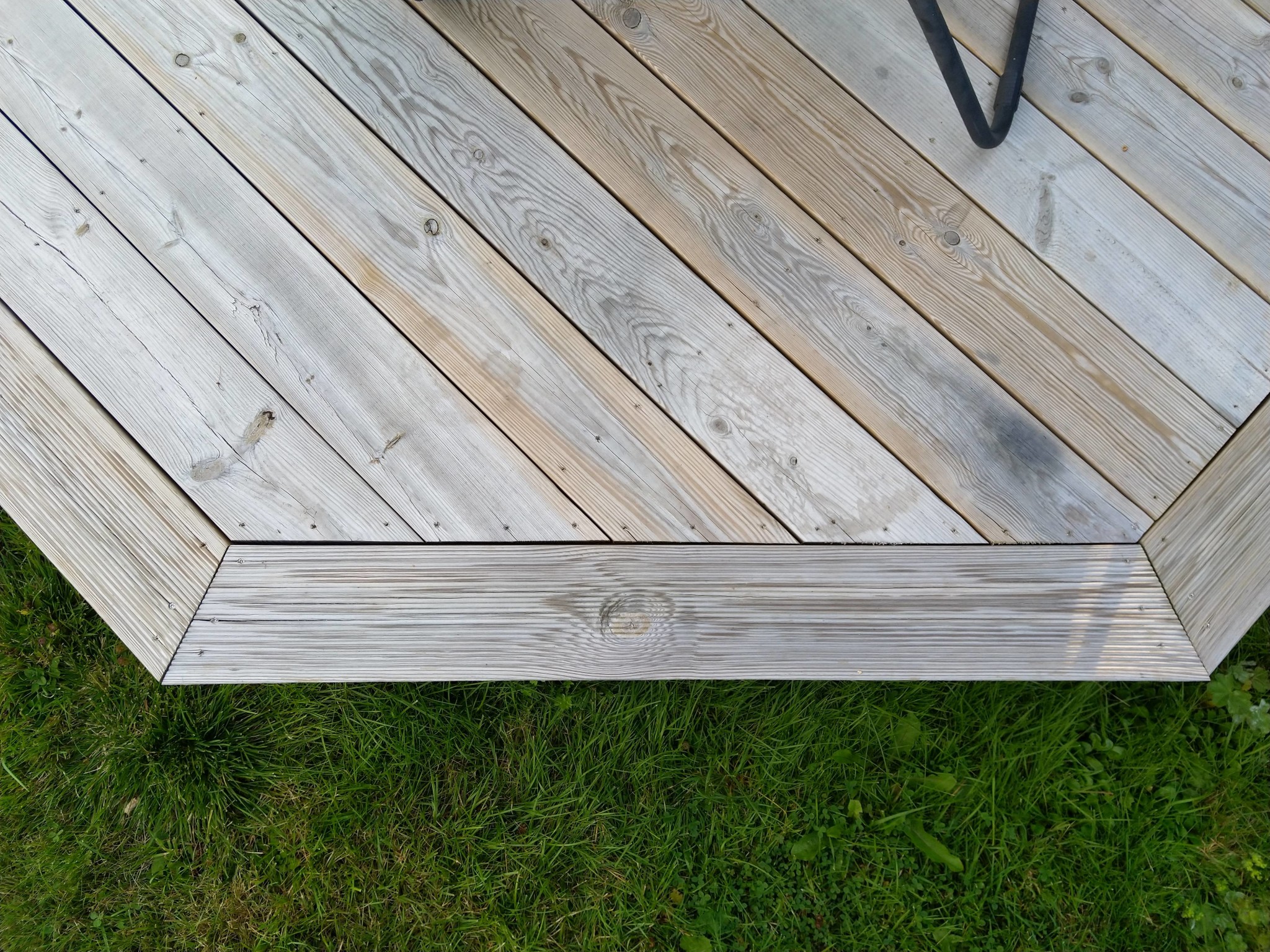 Bjuder på bilder från färskt lagt pooldäck i Juli 2017 och efter två år Augusti 2019 efter några relativt fuktiga och regniga veckor.