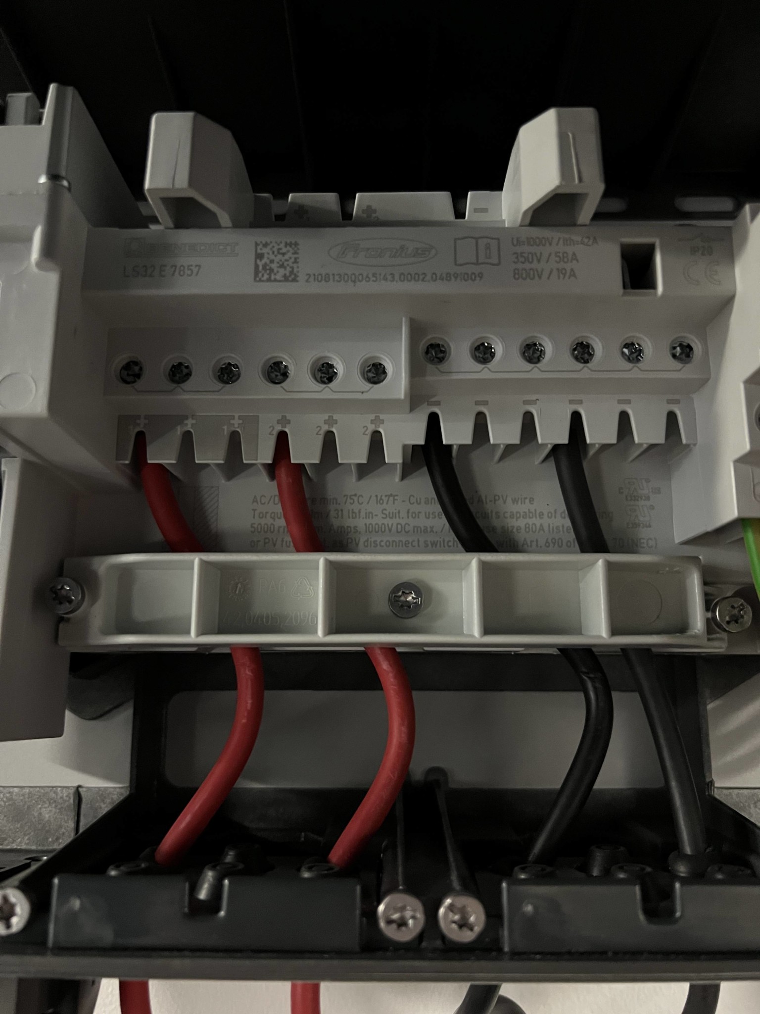De 6 st ingångarna på minusplinten är förbundna i plinten med varandra, och det spelar ingen roll var man sätter minussolarkablarna på minusplinten.
