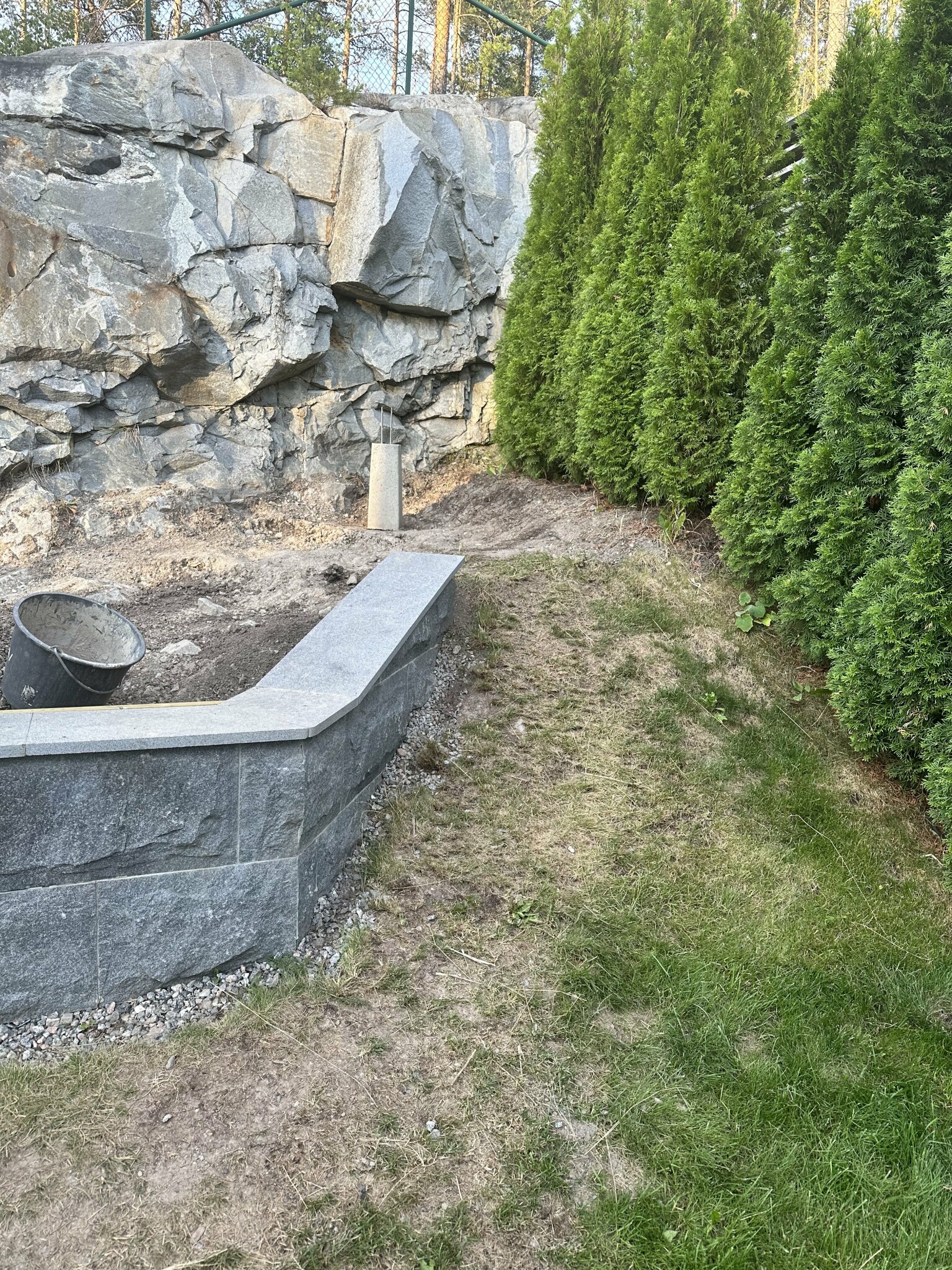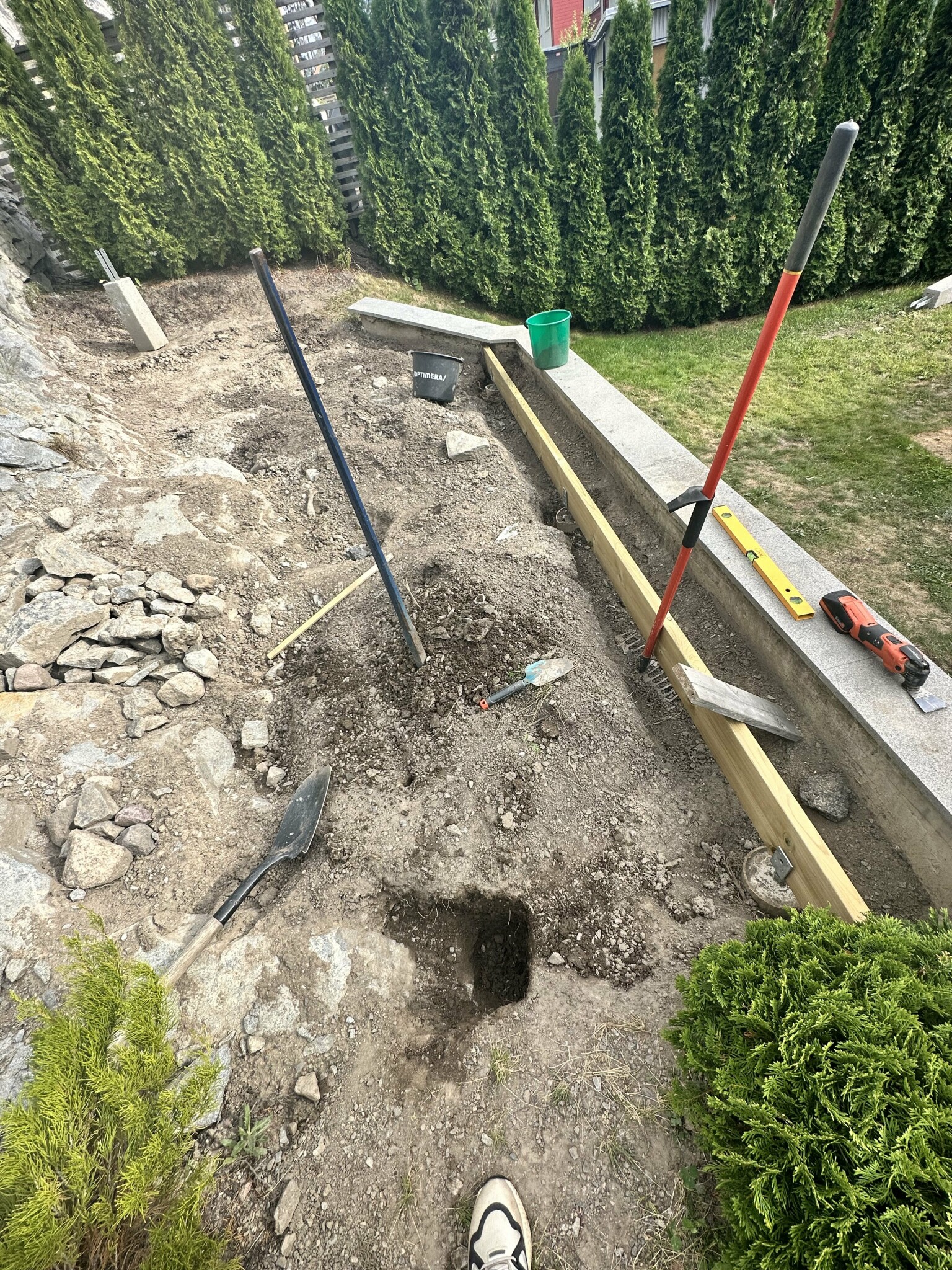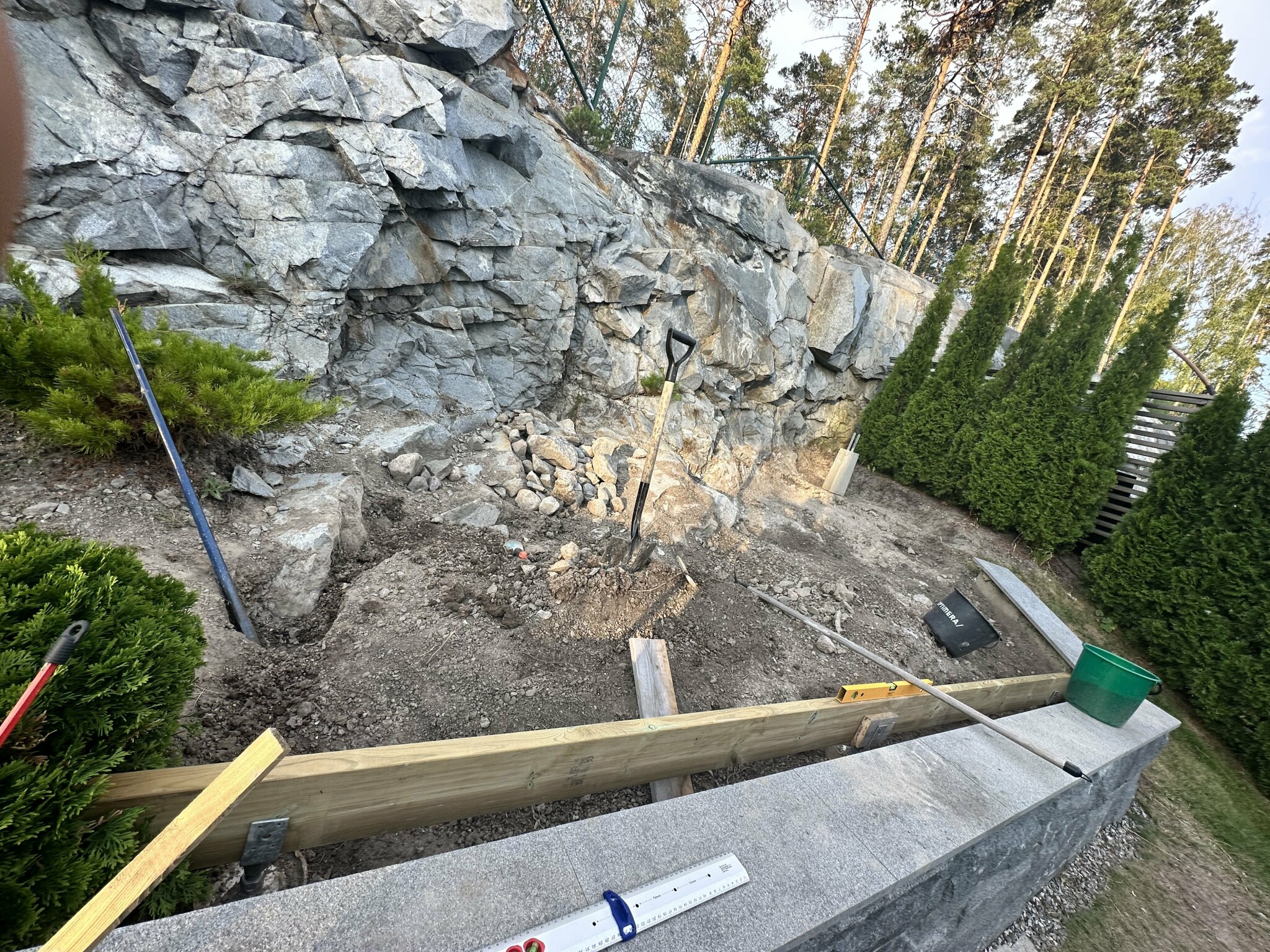 Planen: bygga terrass mot bergväggen med trappa (ca 5 trappsteg) upp längs thujorna.