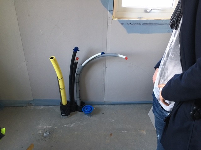Klantigt utfört med rören, ingen jättekatastrof men illa. Man kunde bytt till smartlinerör för att rädda det lite när man insåg felet då det bara verkar vara muffdelen som sticker utanför. Ännu hellre tjockat på väggen när man slog ut den och insåg att den skulle gå innanför rörets diameter.