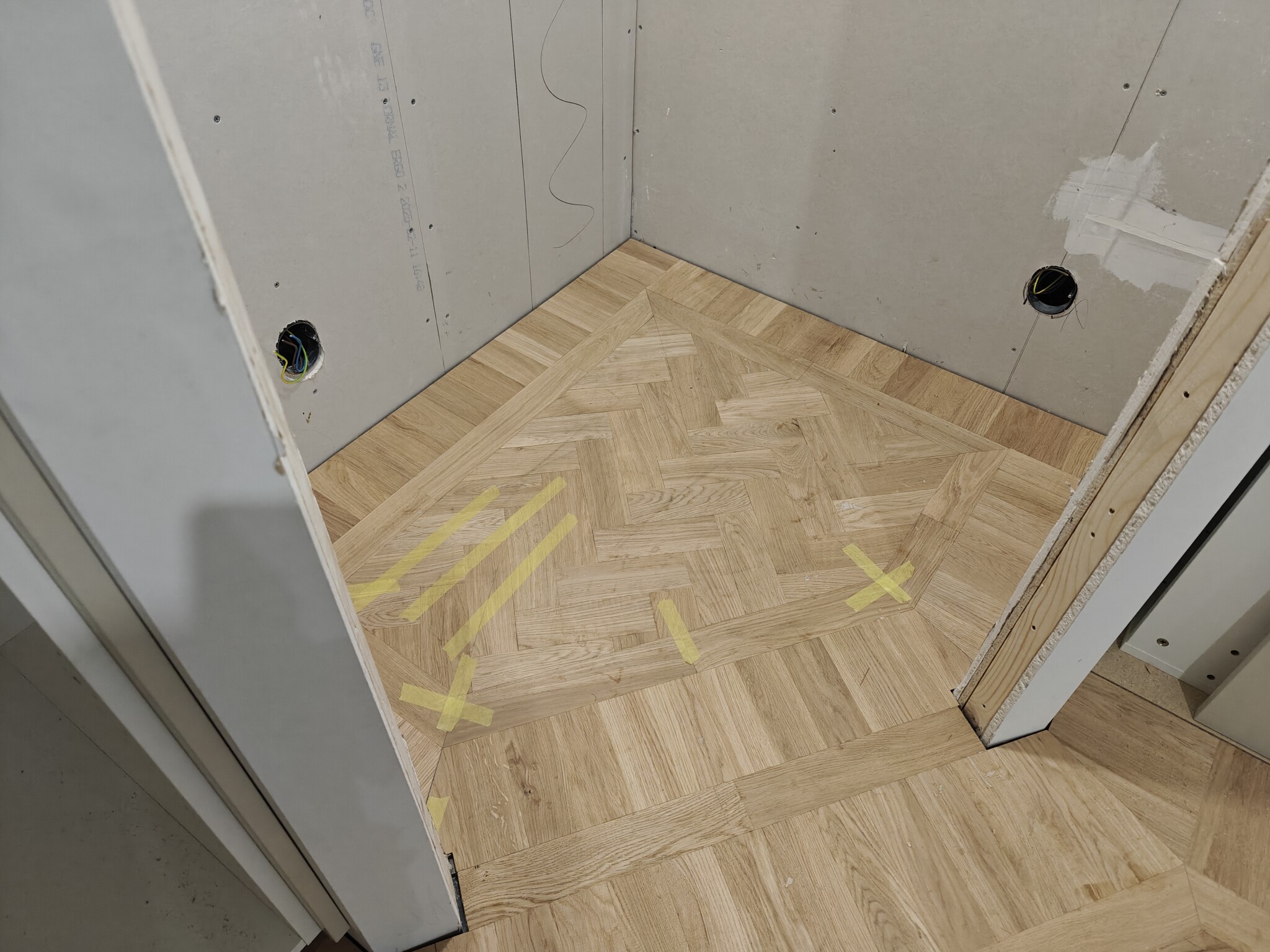 ... Har inte mer info än så. Nöjd med resultatet. Just parkettläggningen var en av de få saker i detta projekt där jag tog in en annan leverantör, annars görs nästan allt allt av samma firma.