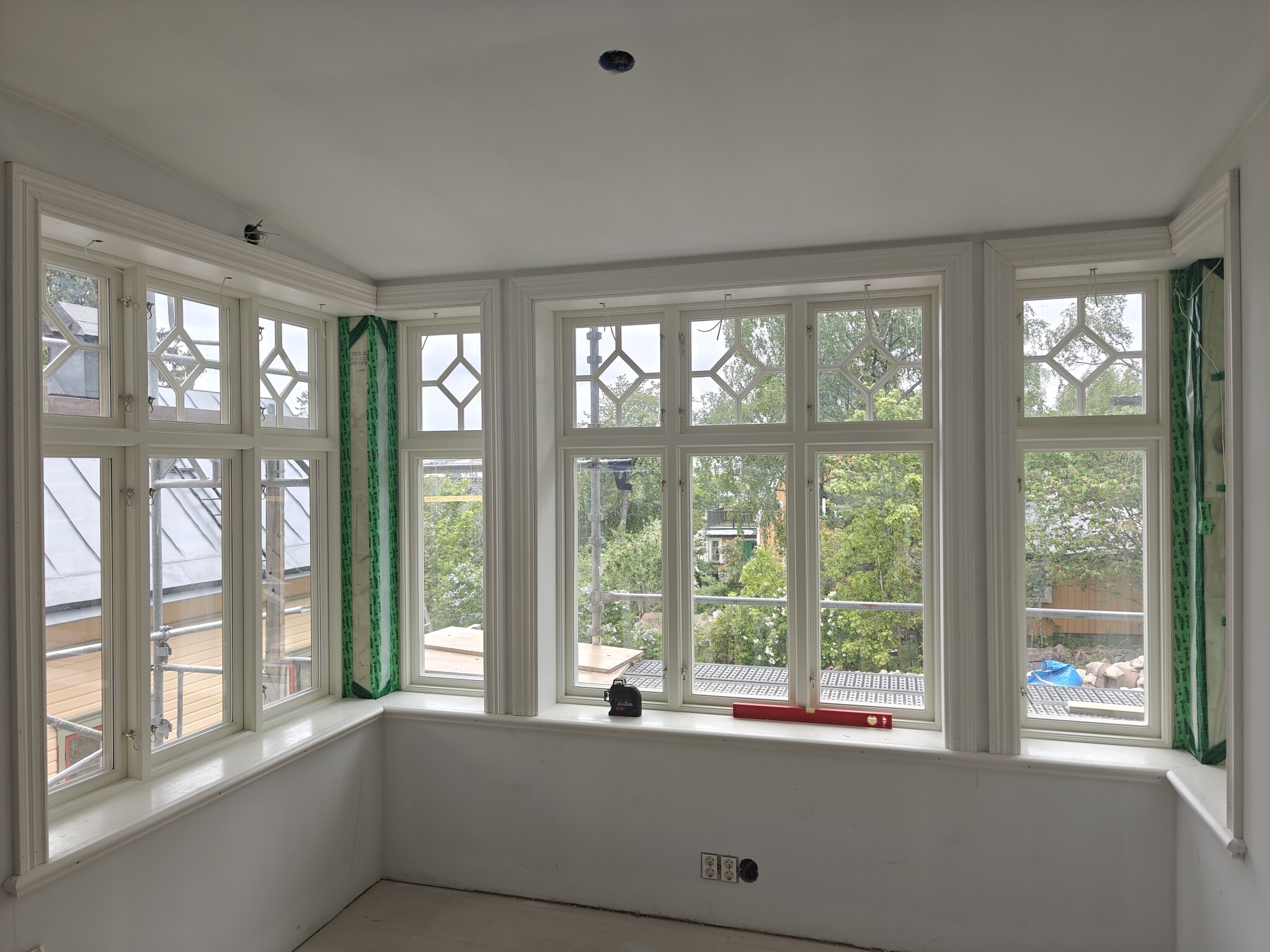 En mängd fönster med lite mer spröjsning har kommit på plats. Det finns ju en liten "glasveranda" i två våningar. Det skall sitta färgade romber i dessa (nu är det klart plexiglas i väntan på beslut om färg/glas på romben).