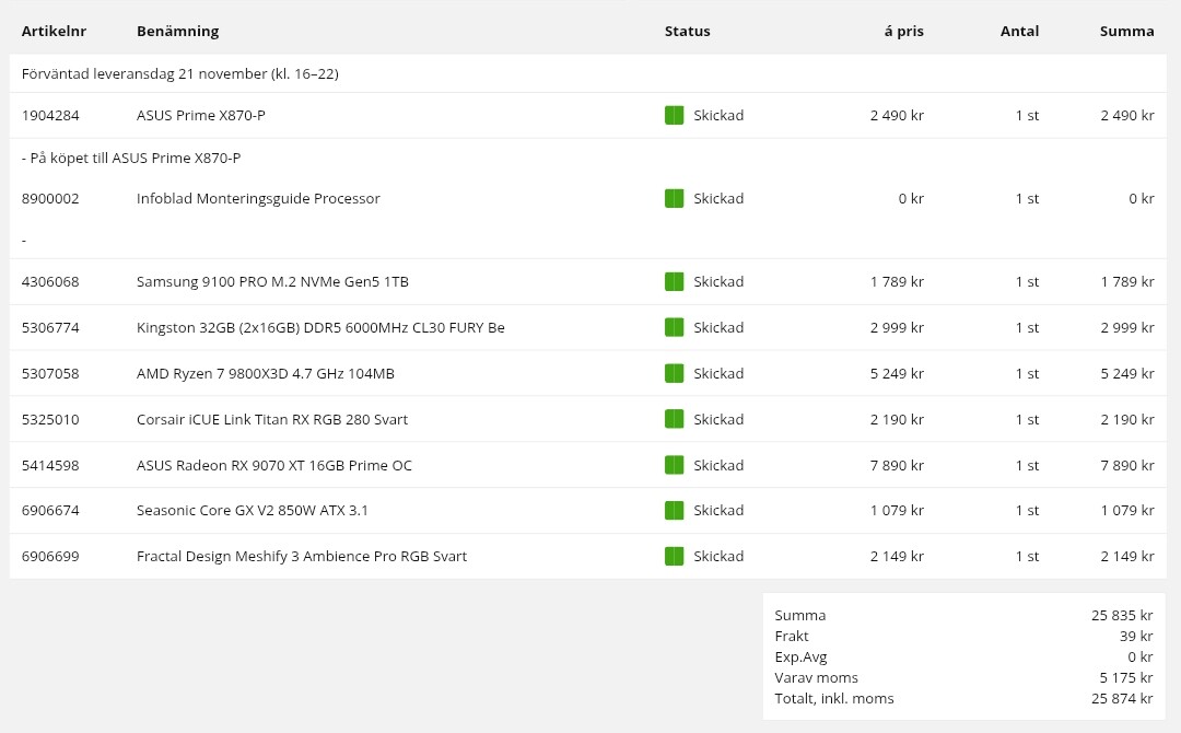 Tyckte jag skulle satsa på mig själv eftersom det var minst ett decennium sen senaste uppgraderingen. Grafikkortet funkade visserligen men hade inte mycket till prestanda. Samma med bildskärmen, började kännas mossigt. Målet var att kunna köra flygsimulator med VR-goggles bland annat, CAD-program mm så det fick bli en AMD RX 7900 XTX *(1) och Samsung 32" 4K gamingskärm. *(2) 😎S sallad skrev:Måste göra en updatering här.
