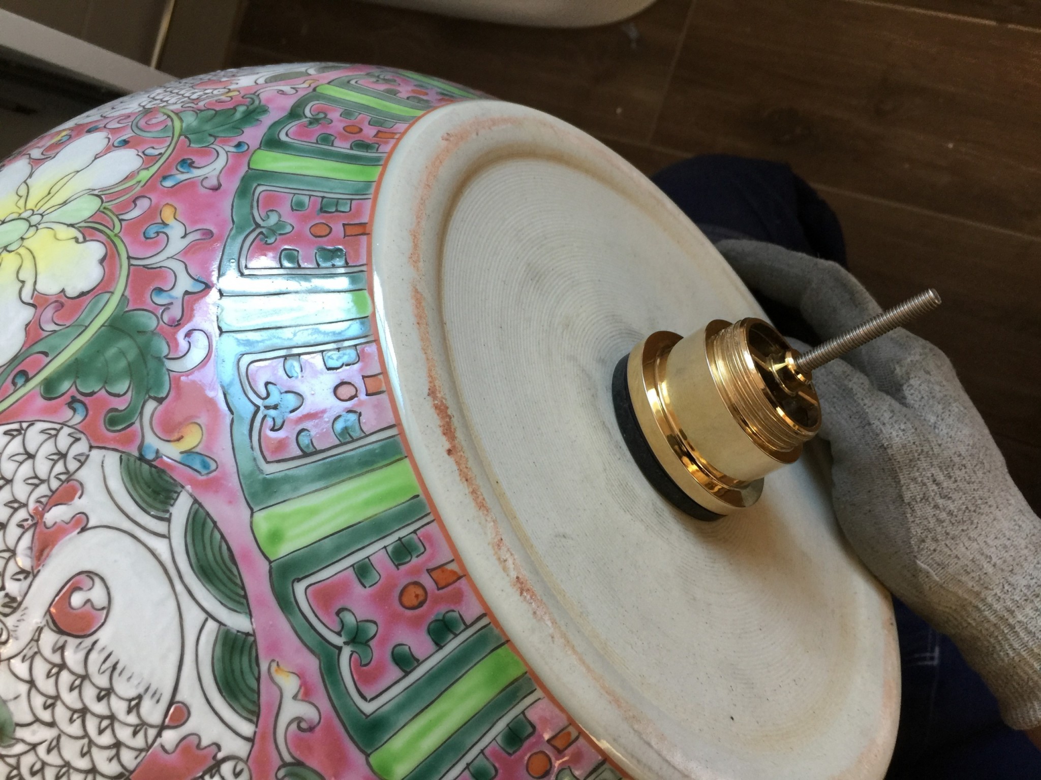 (den röda markeringen i bilden) så att även om bottenventilen är fastskruvat på porslinet så är det en lucka så det kommer vatten under porslinet fast ovanför bänkskivan (att den droppa ner i vattenlåset är bara en bråkdel av all vatten som läckts). Så nu tänkte vi lägga in en extra gummipackning mellan den röda markeringen för att kompensera gapet.