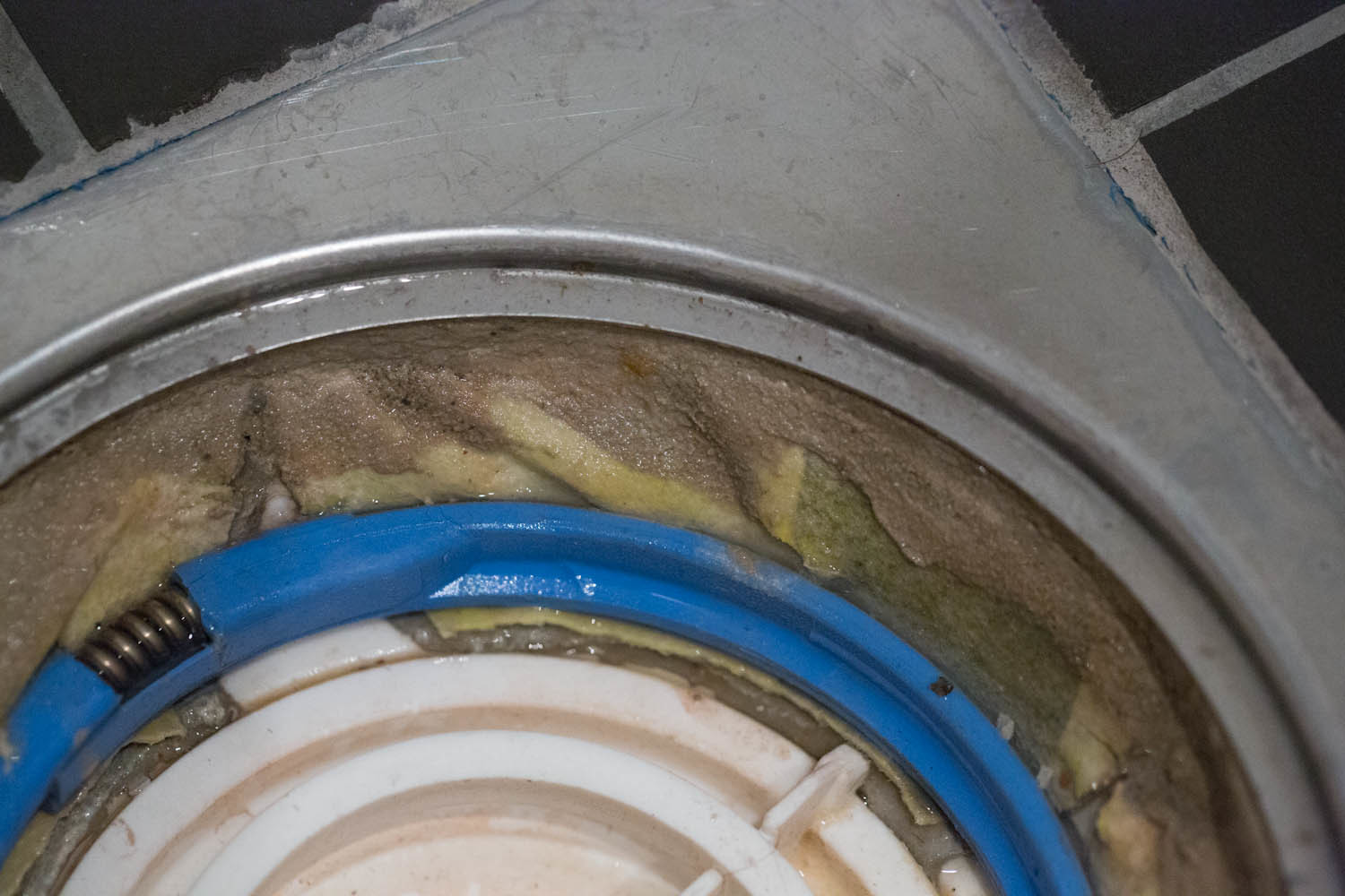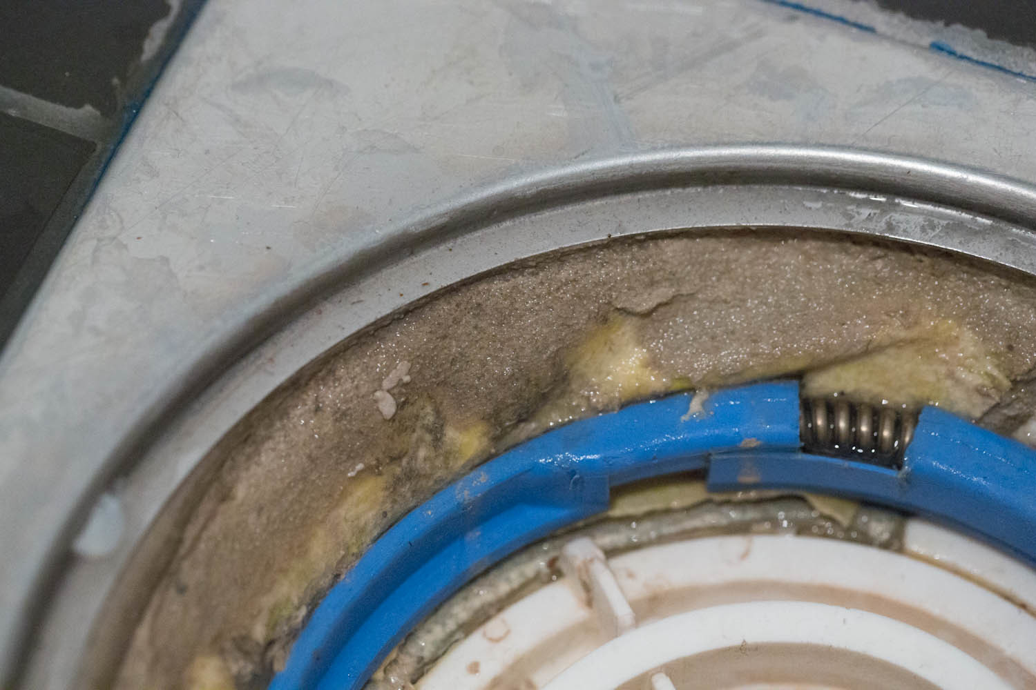 Duken runt golvbrunnen ser ut att vara veckad och kanske inte heller ligger stumt mot underlaget. Kan du känna efter. Duken ska inte svikta.