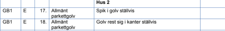 Inspektören gjorde följande kommentar i den tvååriga besiktningsrapporten: 1) Spik i golv ställvis och 2) Golv rest sig i kanter ställvis.