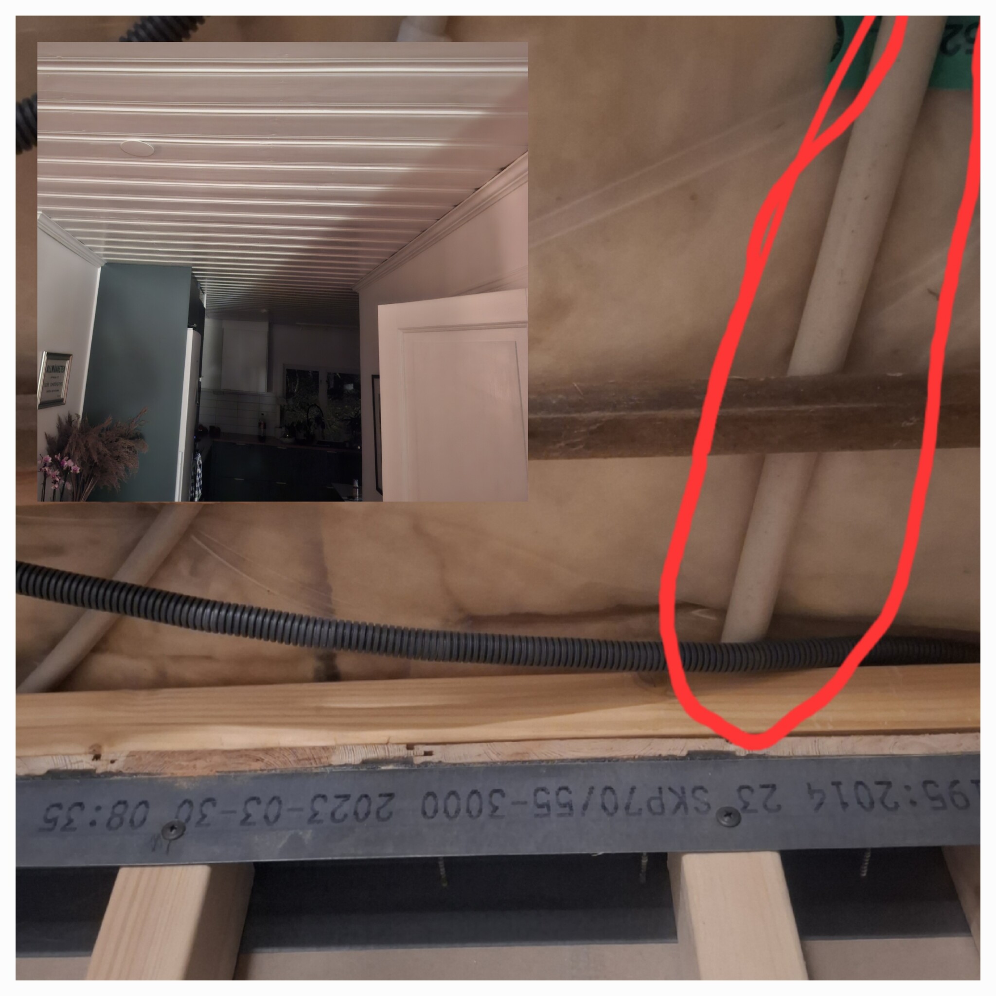 Det inringade röret går raka vägen till centralen (går mellan central och varmvattenberedare, mm.) Går det att få in någonting från badrumssidan, under plasten, och fram till centralen på rimligt vis tror ni, eller måste jag upp på vinden och plocka bort >500mm isolering, göra hål i folien, få skiten på plats, tejpa och tillbaka med isoleringen?