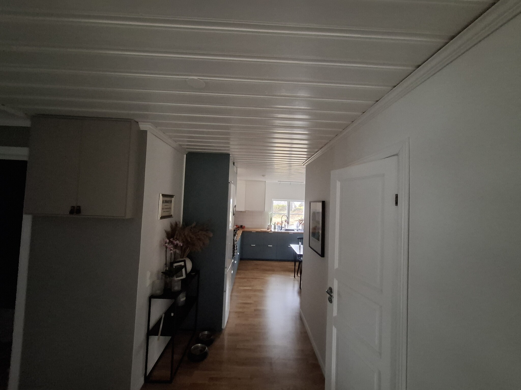 Den ena långväggen är flyttad ca 60 cm, varför den biten idag saknar ytskikt. Första bilden nedan visar takvinkeln mot hallen.