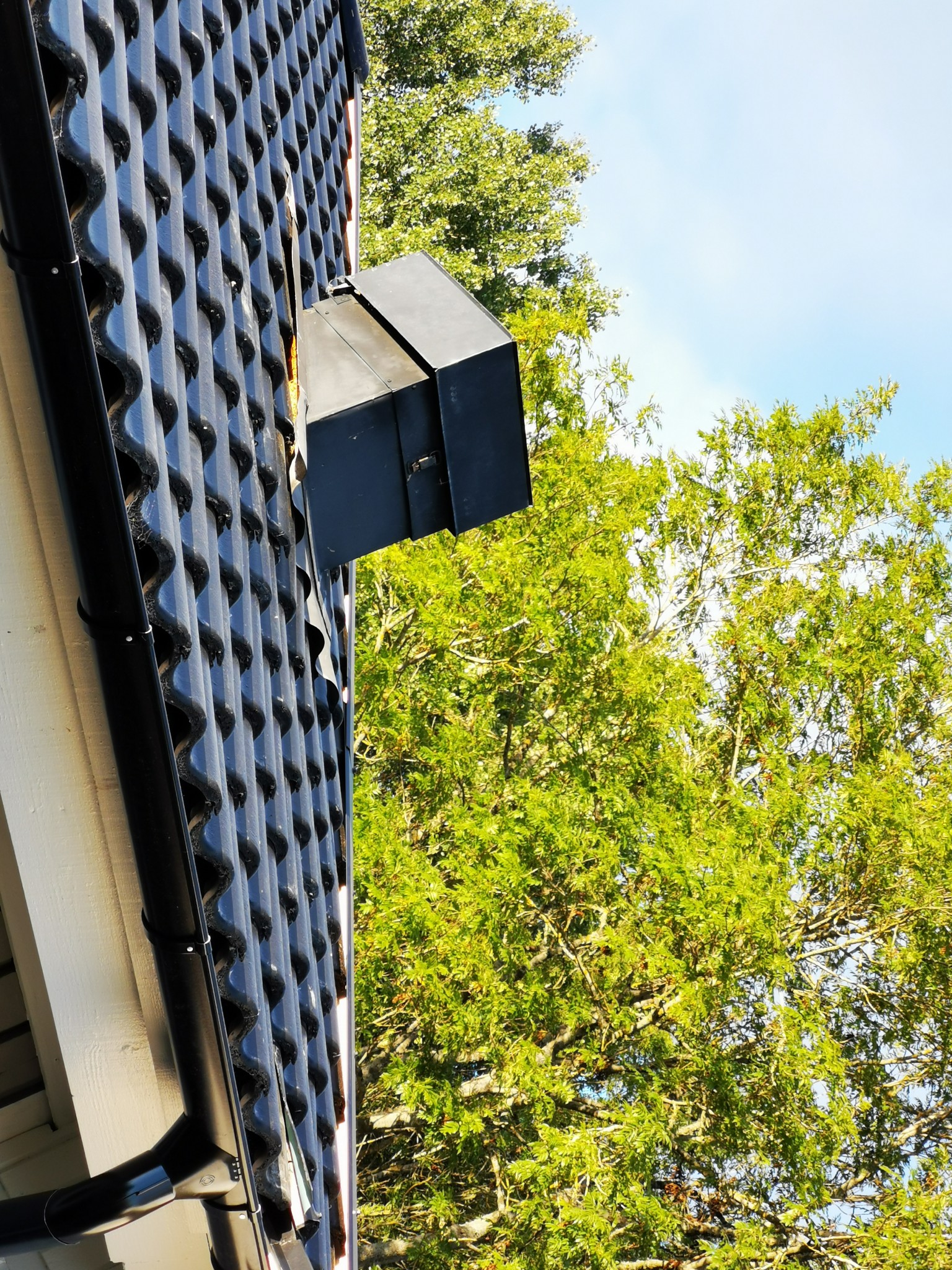 Möjligen att den skulle va tätare, man vill att det konkava på pannorna hamnar där man sätter vindskiveplåten så det sluter tätt bättre. Du menar papp på baksidan av vindskivebrädan? Då skulle ni lagt ut takpapp vid bytet av taket, lämnat en bit på gavlarna och sen vikt upp den på vindskivan innan plåten monterades.