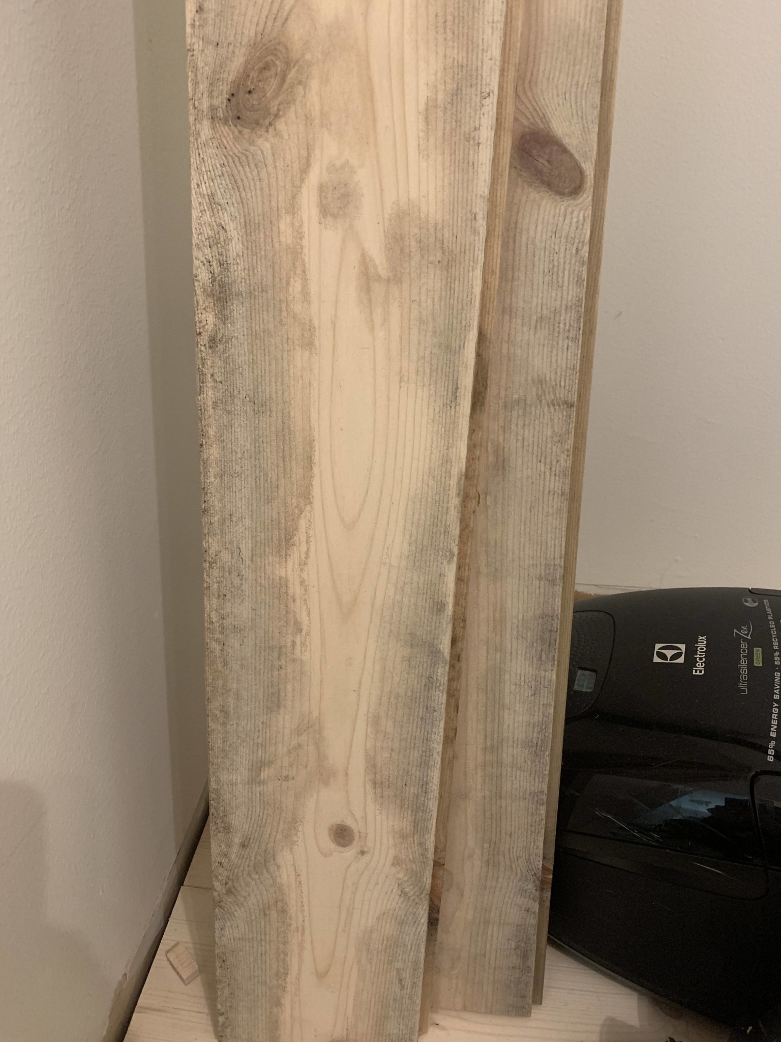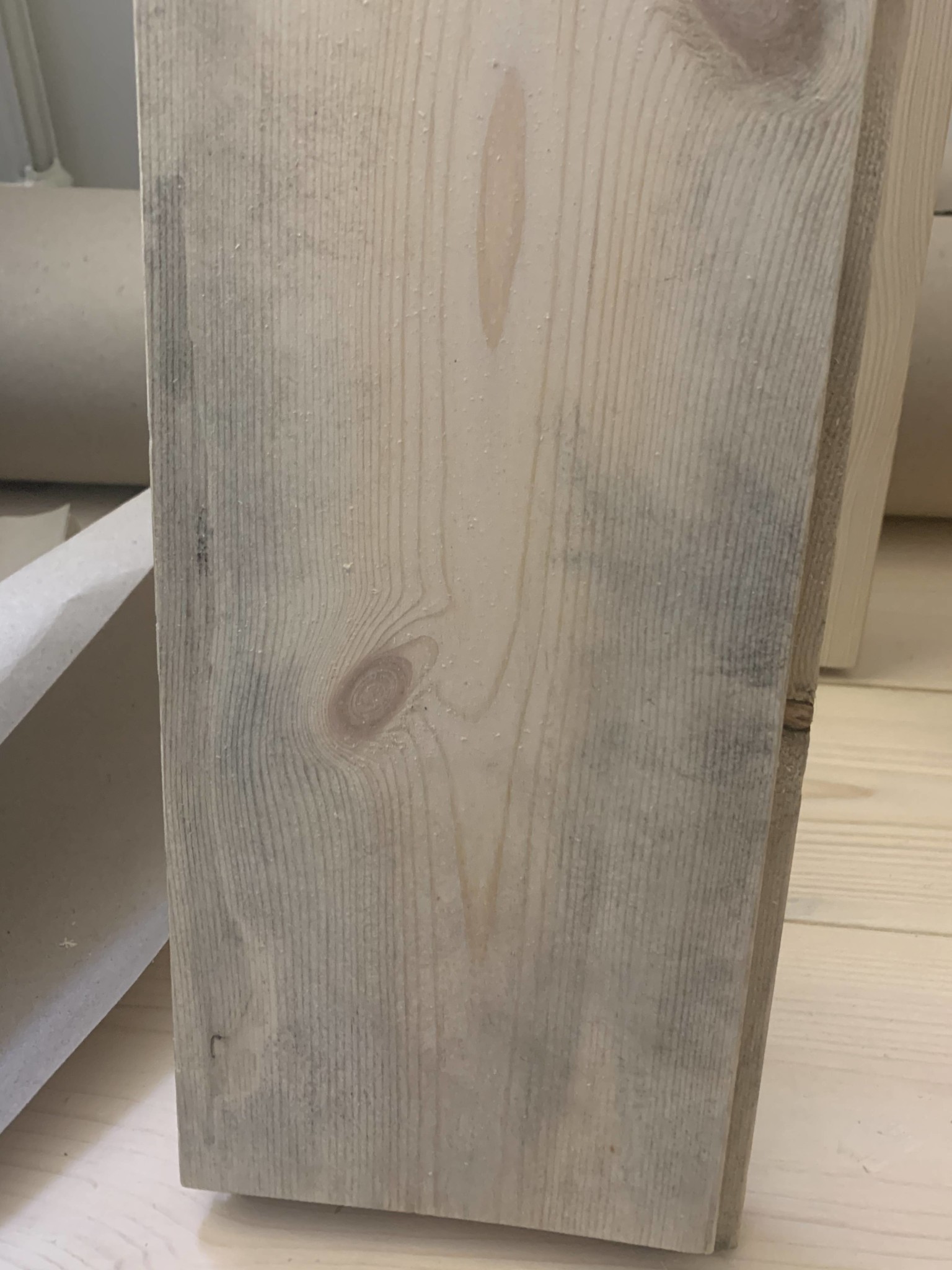Om jag gissar så tror jag mögel och att jag inte är riktigt klok som lägger det. Men nu är det lagt iaf. Precis avslutat en rond med golvslipen och efter det grova pappret är det fortfarande delvis kvar. Har även testat ett sorts tvätt från Rubio men utan bra resultat. (På en lös planka ej resultat på bild)