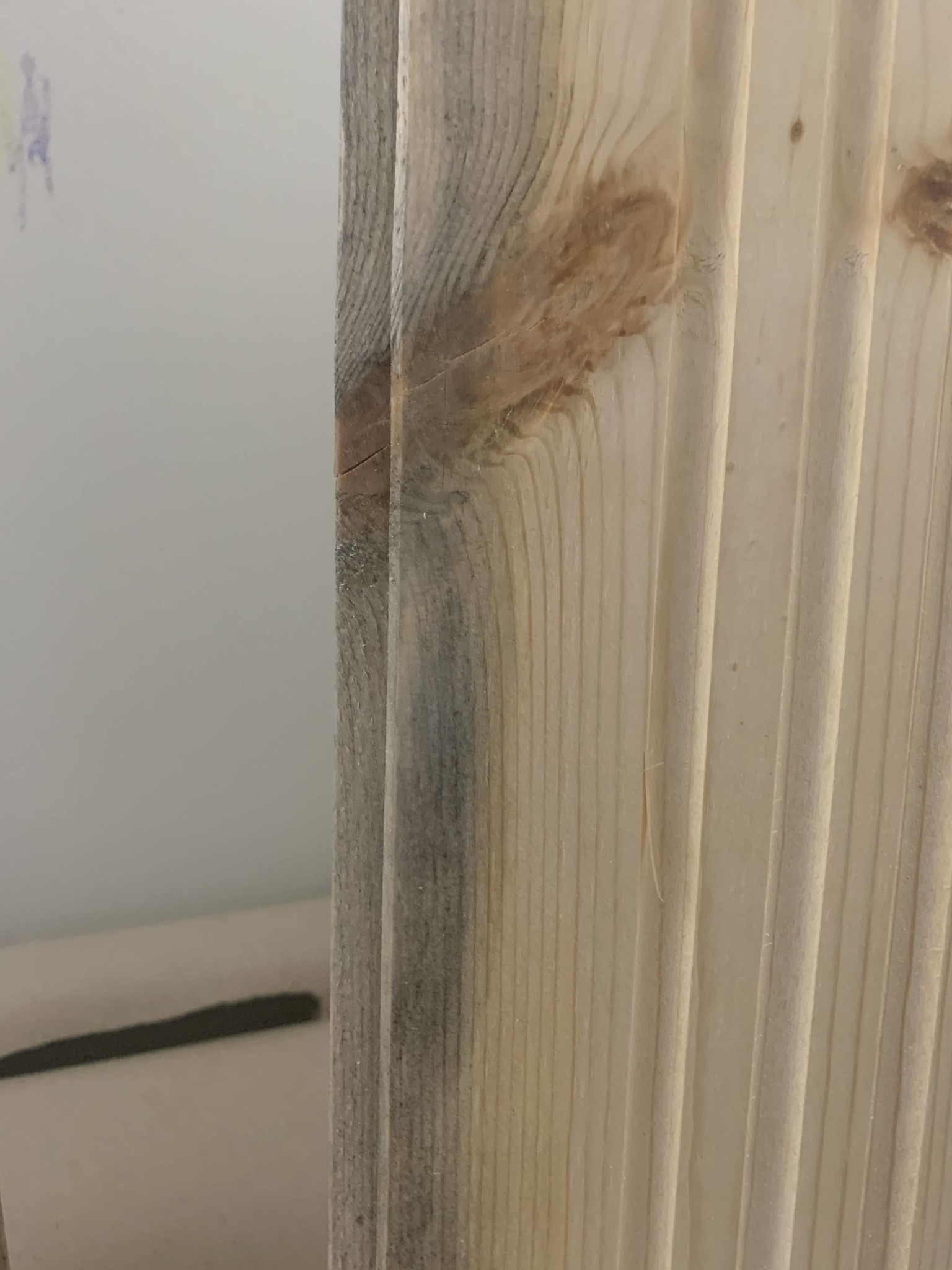 Svårt att säga från bilder, men det ser ut som att det kan dels vara blånader här och där, men mestadels smuts och fukt som genererat mögel. Vilket som så går det ner i porerna på träet, så det blir mkt att slipa för att få bort allt. Blånader är jag lite osäker på, men tror att de kan sitta ännu djupare.