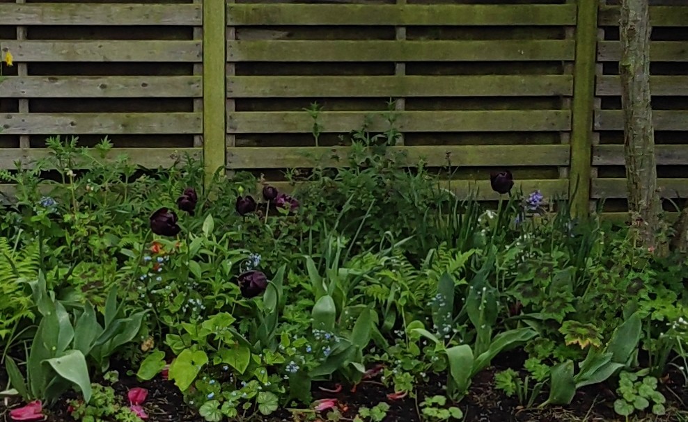 Nu har de färggranna tulpanerna blommat över och Queen of night står kvar tills med brunnävan som tar upp den svarta färgen. Jag ska sätta dit jätteverbenor också. Förhoppningsvis ska jag få lite hjälp med det idag. Har massor med sticklingsplantor som blommar sedan flera veckor tillbaka. Ville dock vänta ut de första tulpanerna.