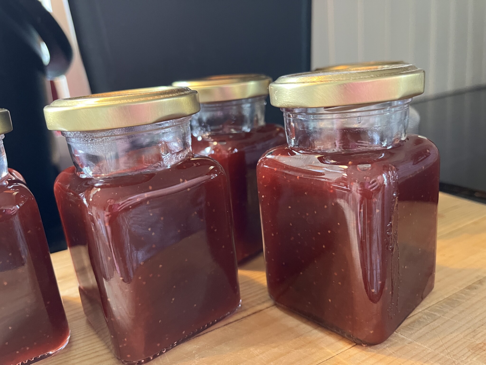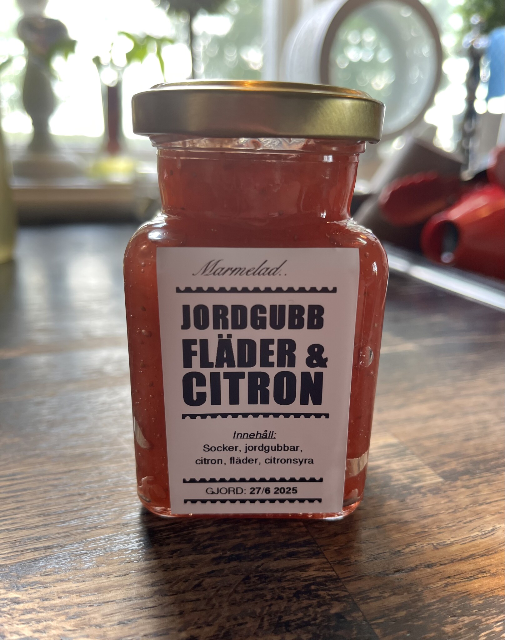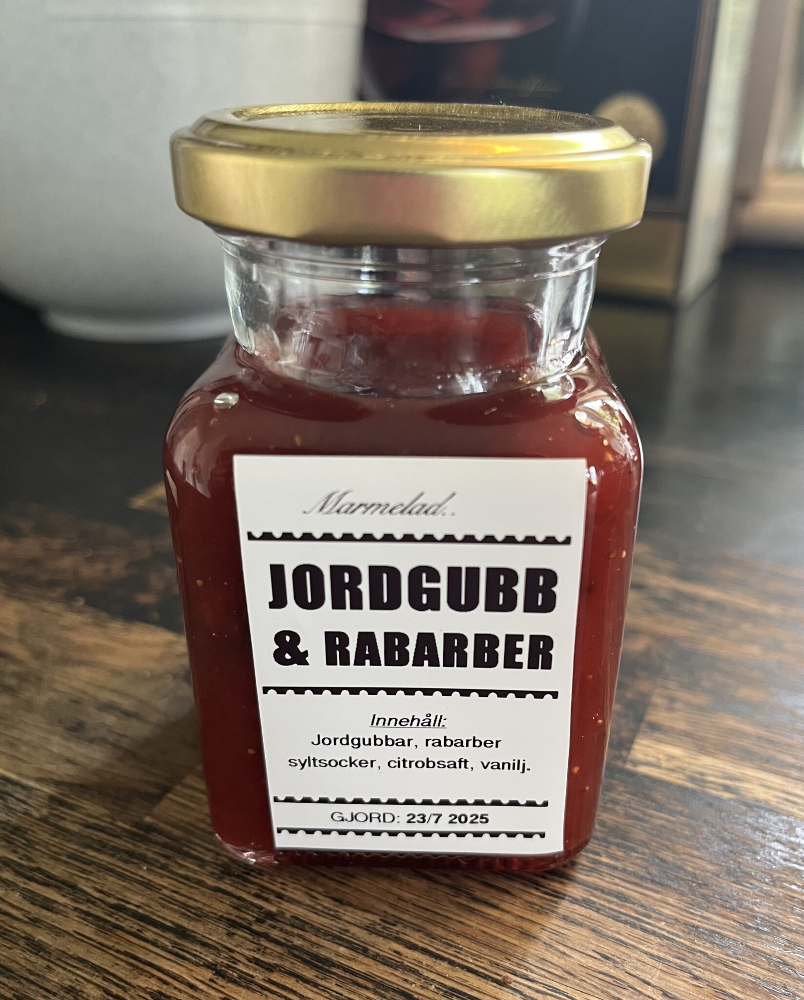 Jordgubb & Rabarbermarmelad (inkl stavfel på skylten haha - men bara till mig, så det bjuder jag på.. )