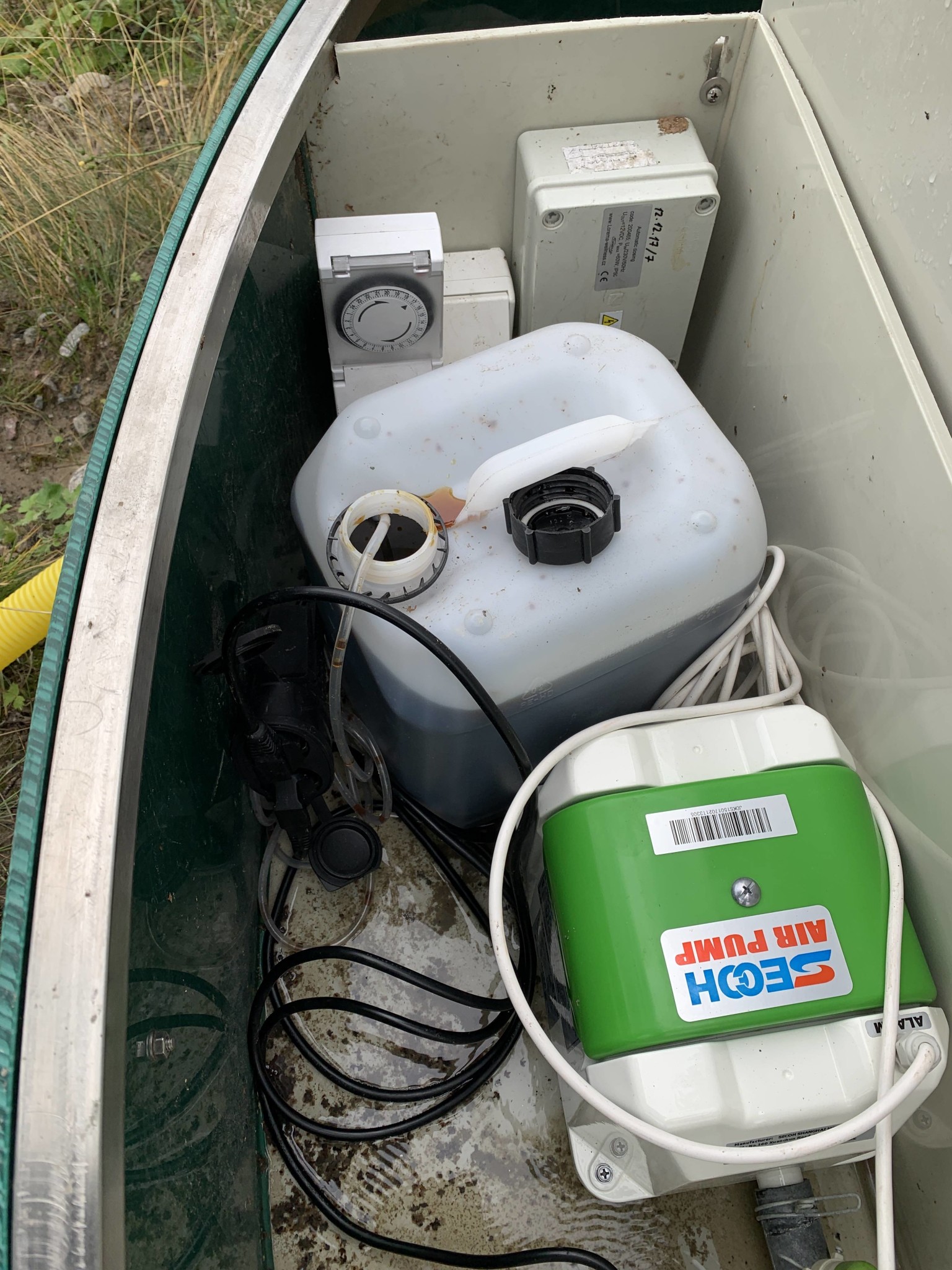 Från grendosan går vanlig vit kabel (ej för markförläggning) i gula skyddsrör, ovan jord.
