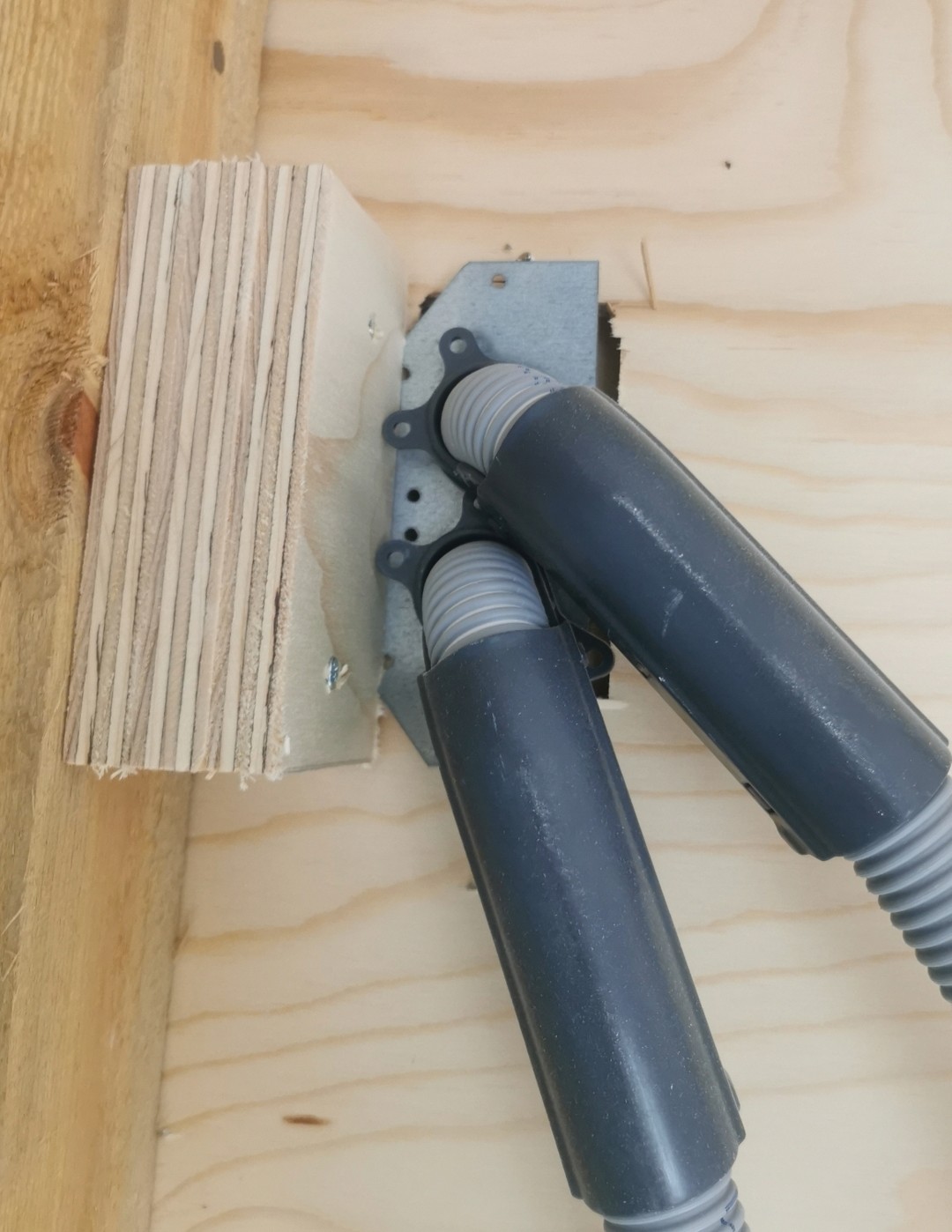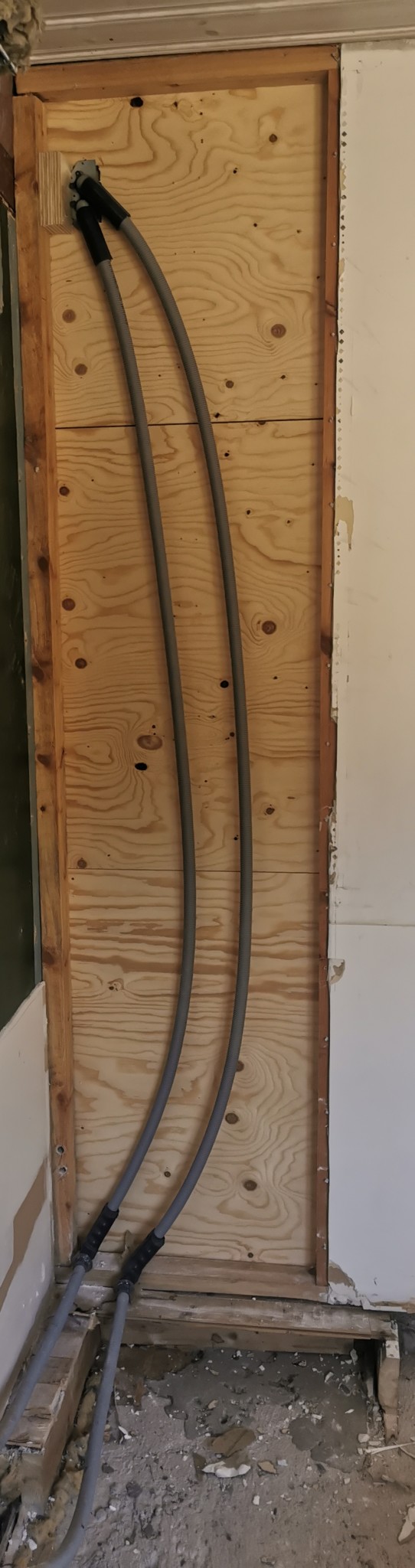 Väggen är för tunn för att få plats med dragningen, så plyfan har därför i skruvats i regeln i nedre hör (skapar utrymme).
