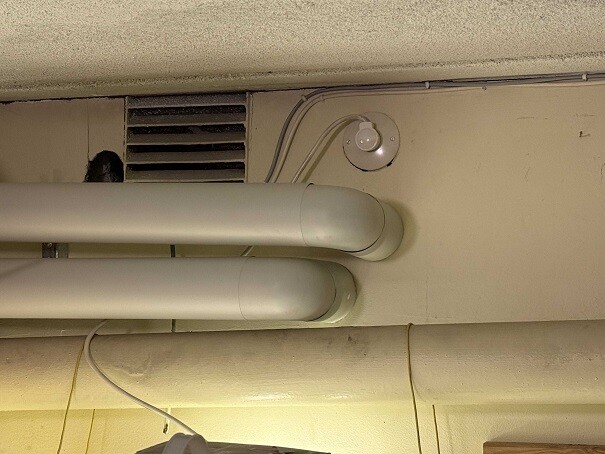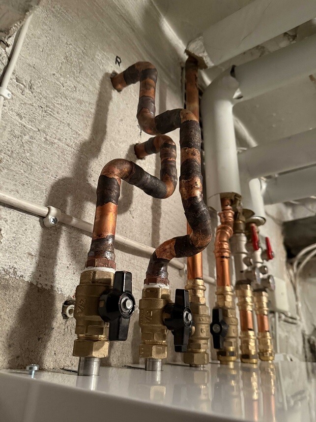 På den tidigare fjärrvärmecentralen satt returledningen för fjärrvärmevattnet längst till vänster med tilloppsledningen direkt till höger om denna (se bild 1). På den nya fjärrvärmecentralen har dessa "bytt plats" med varandra. Istället för att förlänga tilloppsröret i det angränsande rummet (det nedre röret på bild 2) och göra ett nytt borrhål, vilket hade möjliggjort en rak rördragning även till den nya fjärrvärmeväxlaren, har installatören svetsat rören om lott om varandra i en "kringelikrok"-lösning (se bilderna 3 och 4). Min misstanke är att det är denna "kringelikrok"-lösning som orsakar det ökade susljudet eftersom det framforsande fjärrvärmevattnet pressas igenom ett flertal böjar som inte fanns där tidigare. Min misstanke förstärks av att susljudet på returledningen, som har flest och snävast böjar, är tydligt högre än motsvarande susljud från tilloppsledningen. I det angränsande rummet, där fjärrvärmerören är dragna och slutligen går ut genom väggen, har det också uppstått en mindre vibration i rören vid högt fjärrvärmeflöde som inte fanns där tidigare.