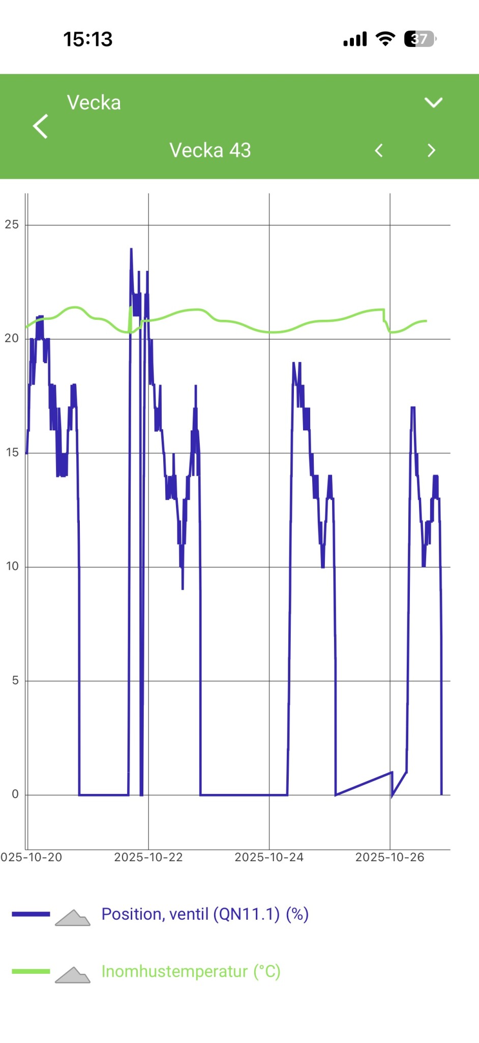 Temperaturen svajar fram och tillbaka mer än med min gamla anläggning i alla fall men det mest irriterande är de kraftiga hoppen mellan 0% och 20 % öppningsgrad och sedan tvärt tillbaka till 0 % igen. Rimligen är väl en jämnare kurva att föredra där kasten mellan varma och iskalla element inte blir så stora? Det måste väl på sikt riskera att orsaka läckage med sådan variation fram och tillbaka (expansion/krympning -> materialutmattning). TILLÄGG: Nattsänkning är inte aktiverat.DE73 skrev: