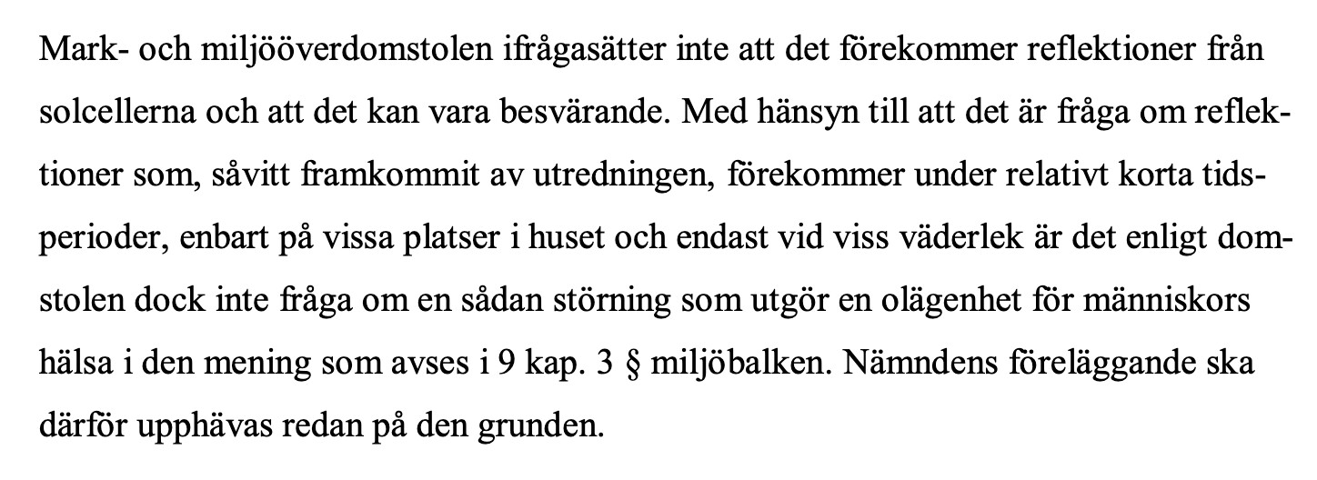 Sammantaget anser jag att det knappast är en så hög grad av störning att grannen ska behöva avstå från sina solceller. Det blir ju effekten av ett motsatt utslag; de flesta villor har i princip bara möjlighet att installera solceller på ett enda sätt.
