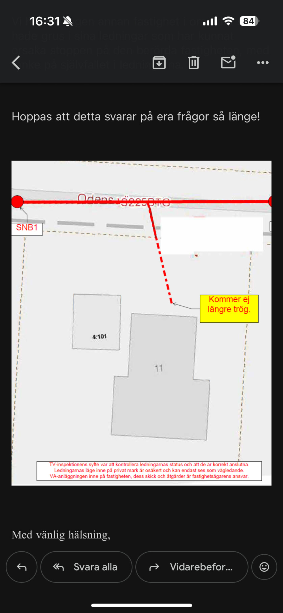 De har gett oss en video på rören, där jag inte ser så mkt ”fel” faktiskt… visst, det är gamla rör, och man kan se att vid skarvar så kan man på något ställe ana att rötter kan tränga in (inga tydliga rötter på videon). Kan knappt se något grus heller.