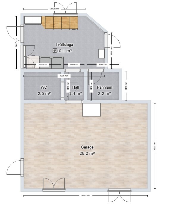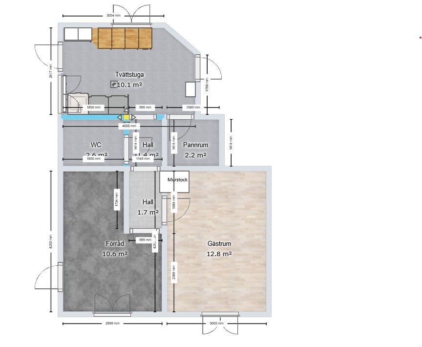 Planen är att dela av rummet på mitten. Huvudspåret är att inte ha ingången till rummet från förrådet, utan att förlänga hallen. Detta för att hålla isär "smutsig" och "ren" zon.