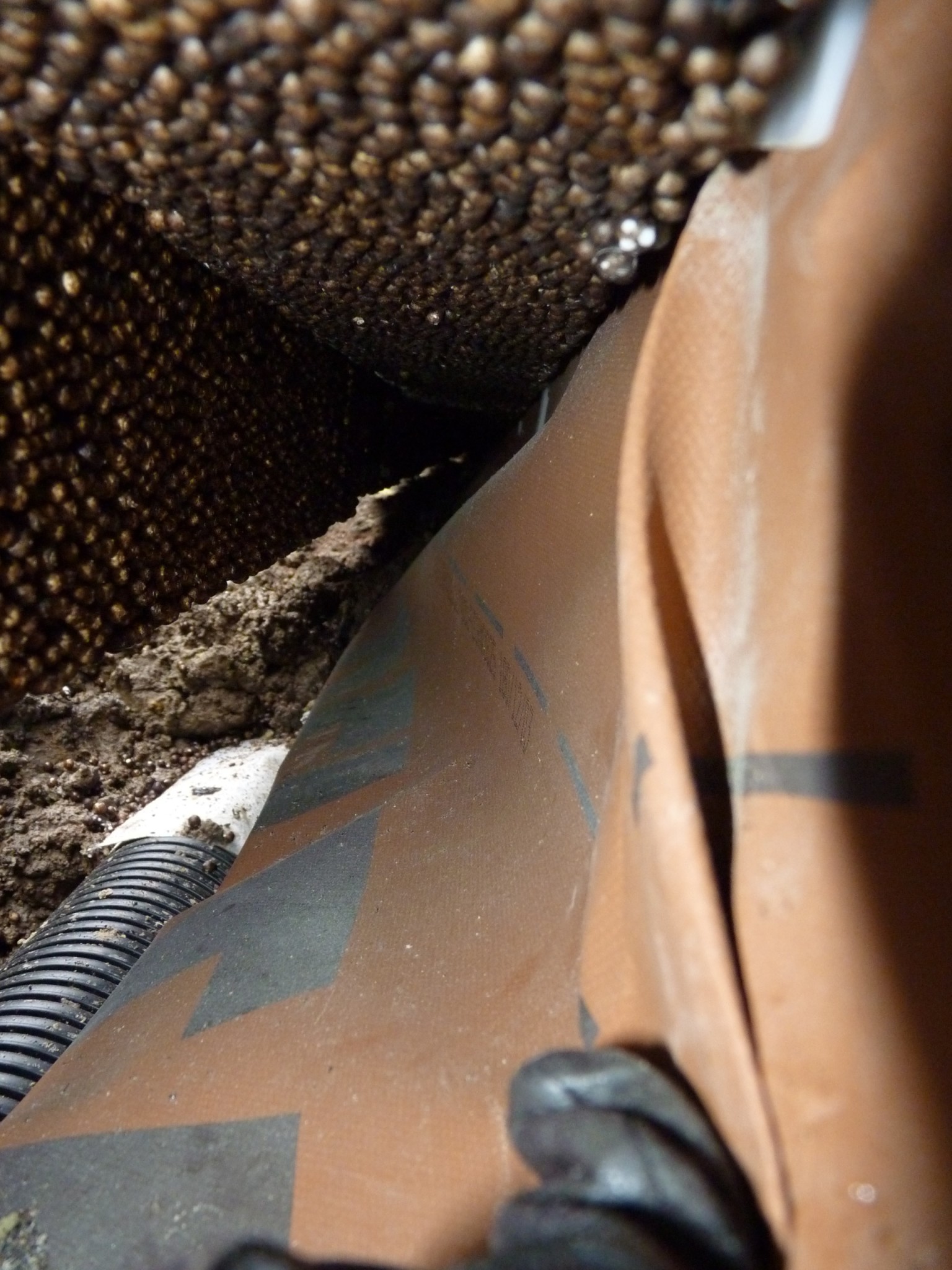 Bild 1: Här kan man se glipan. Källarväggen är till höger, täckt av attackmembranet. Det är en rejäl glipa ner till hålkärlet, som jag lägger handen på. Eftersom hålkärlet är mindre än 10 cm brett, så kan man se mellan de två optidrainskivorna, ner mot dräneringsröret: