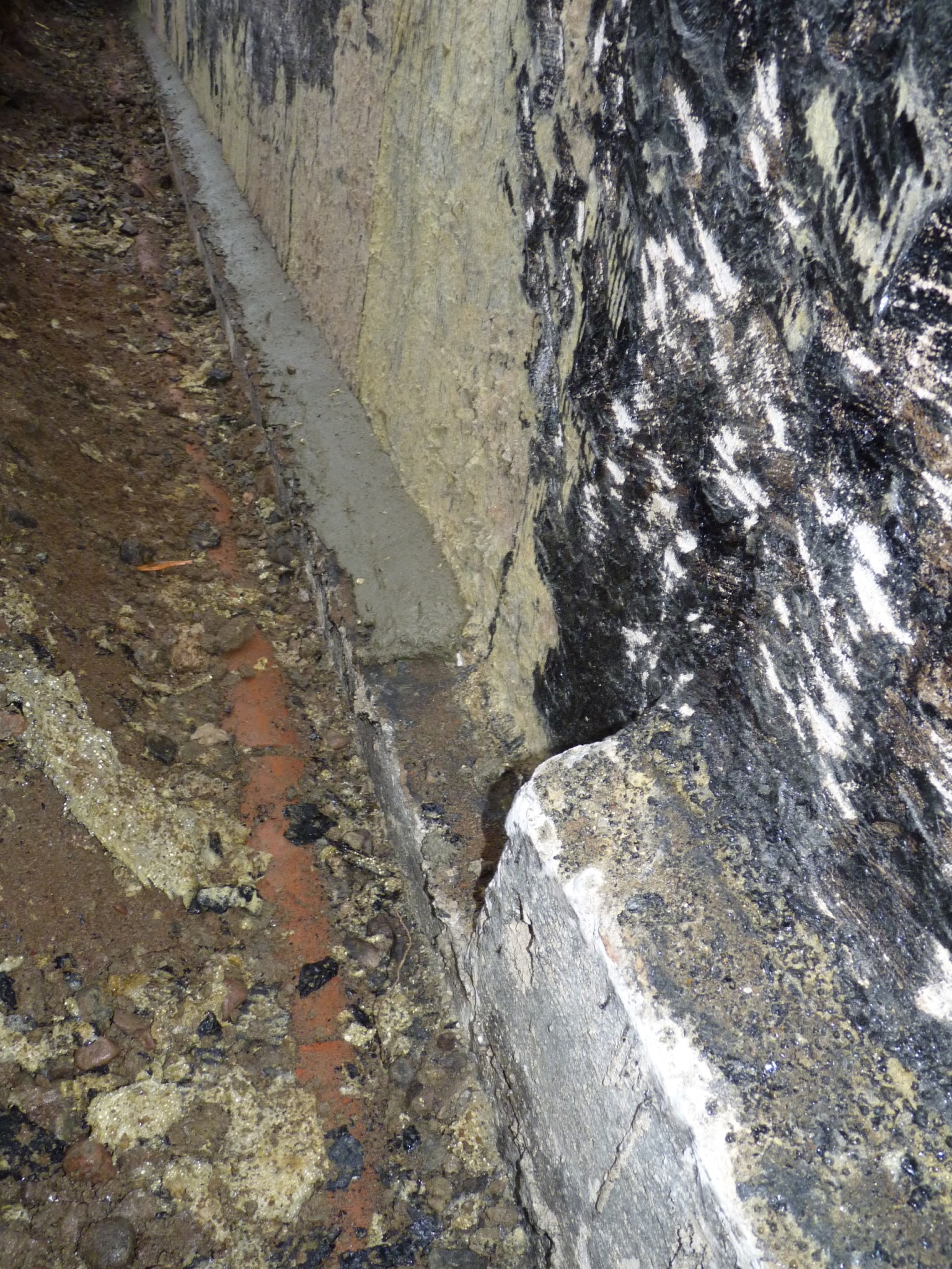 Bild 3: På andra sidan huset ligger fortfarande det gamla dräneringsröret kvar. Här kan man se anledningen till att glipan blir så stor, misstänker jag: Klacken på sulan (hålkärlet) går ner ca 15-20 cm. Om det är detta som är orsaken till att skivorna sitter fel på andra sidan, så sträcker sig glipan ca 10 m längs källarmuren. Jag förstår inte varför de inte flyttade ner skivorna längre ner där höjdskillnaden sker: