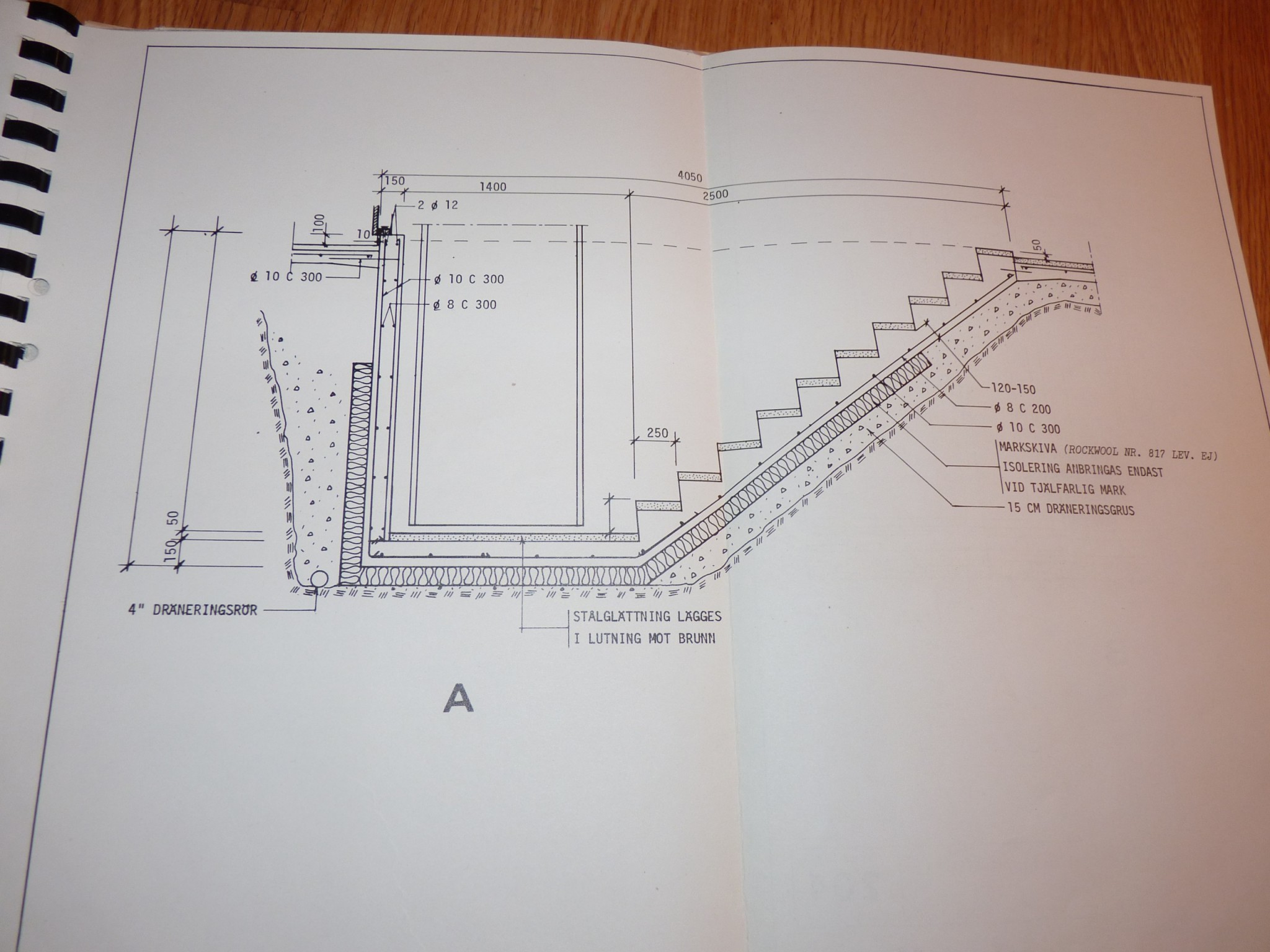 Byggplanen, sett längs långsidan av trappan. I verkligheten går nog den gamla isoleringen högre, men byggplanen verkar bara tycka att det är viktigt när man börjar närma sig frostfritt djup: