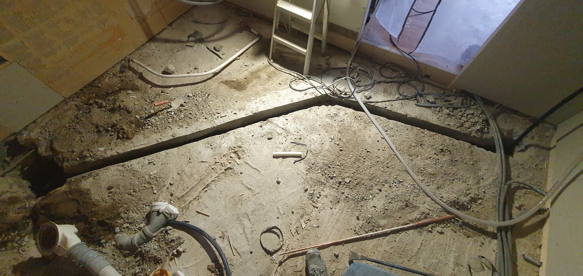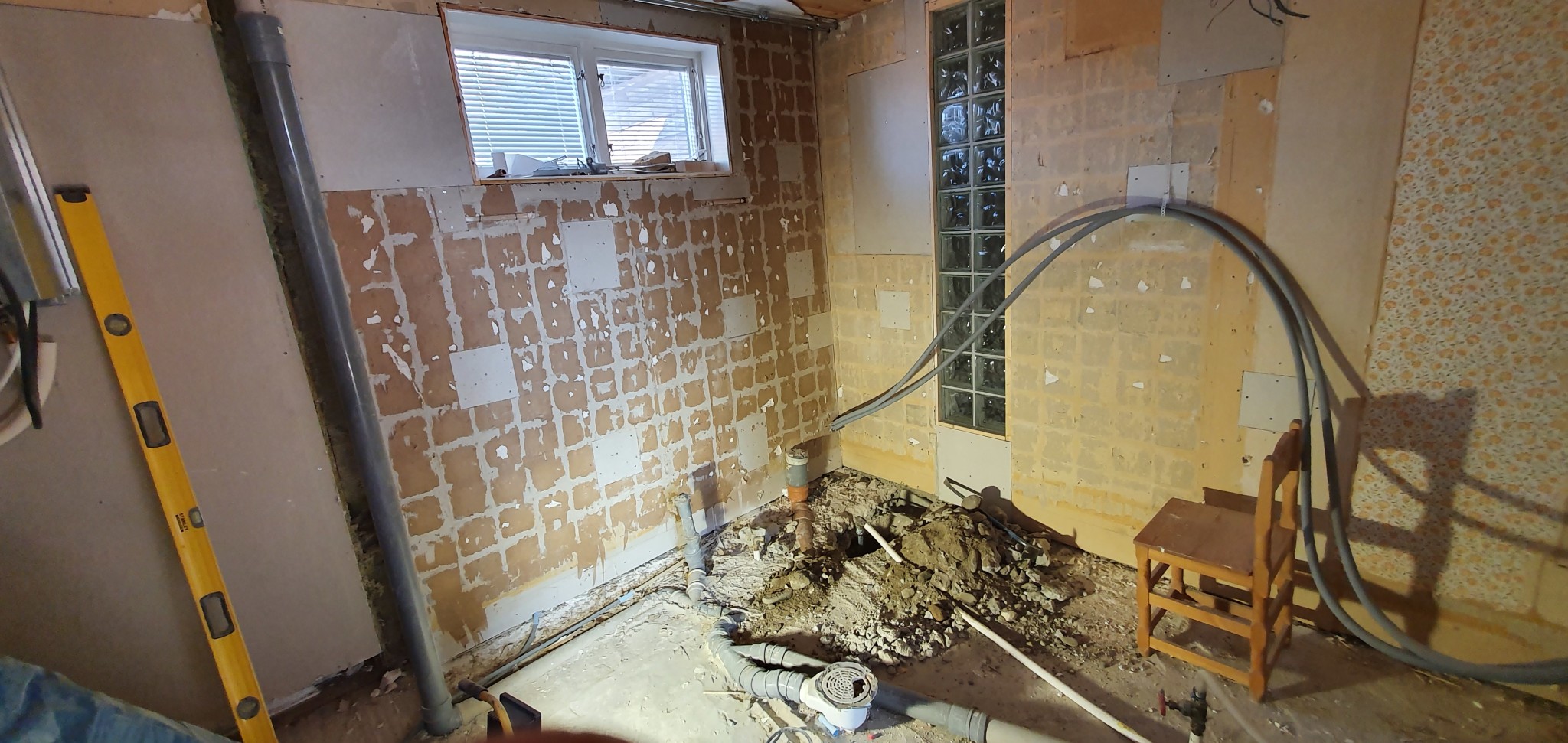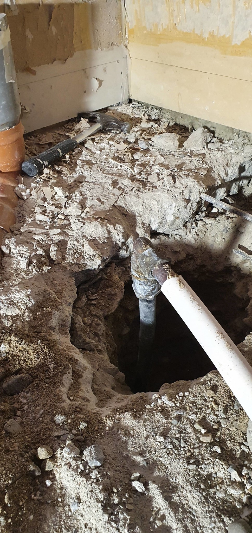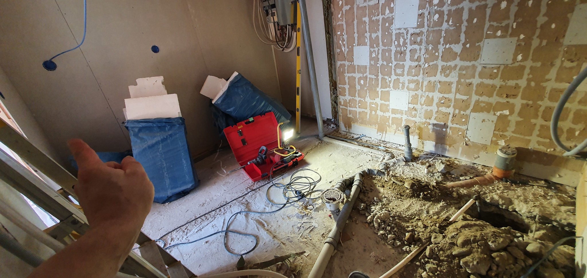 Inkommande vatten. Det är en pem-slang 1" (25,50 mm) som kommer upp alldeles misslagom där porslinstronen skall stå. Den är ingrävd ngn gång på 90-talets mitt. De som kan tänkas veta något hur exakt det är draget "bor" i ettor med jordvärme. Brunnet ligger i ytterkant på tomt, i vägen ligger farstukvisten på platta m. Vattengolvvärme som jag byggde för ett par år sedan (som kan skymtas genom fönstret)