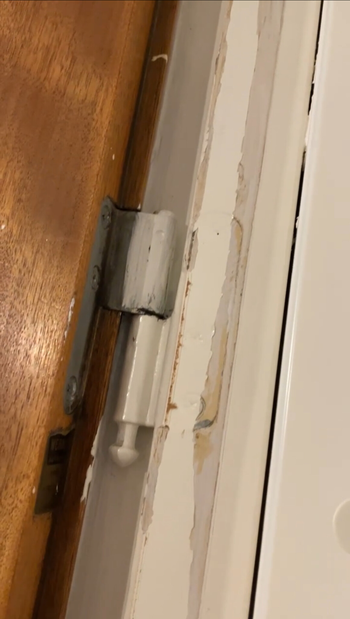 Det finns gångjärn och karm sen tidigare ägare men tyvärr ingen dörr.