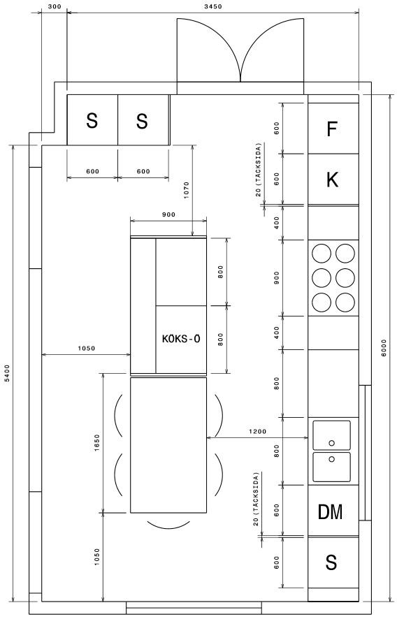 Sedan så förstod jag det som att du tänkte att man kunde möblera in i genomgångsrummet med köket. Jag försökte rita upp det som jag trodde att du menade. Men fick inte till någon vettig lösning. Missuppfattade nog dig, gissar jag, för den enda jag fick till vad ett mer utspritt kök med längre avstånd :-/