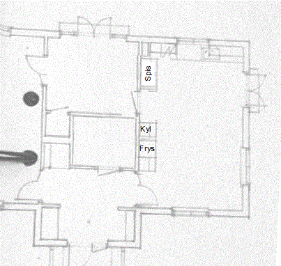 Jag hade inte tänkt någon möblering av köket in i genomgångsrummet, bara köket gör en vinkel där och att väggen (ev) försvinner. Men den kan ju vara kvar också. Grejen är att dörren förflyttas neråt för att skapa yta för ett kök i vinkel.