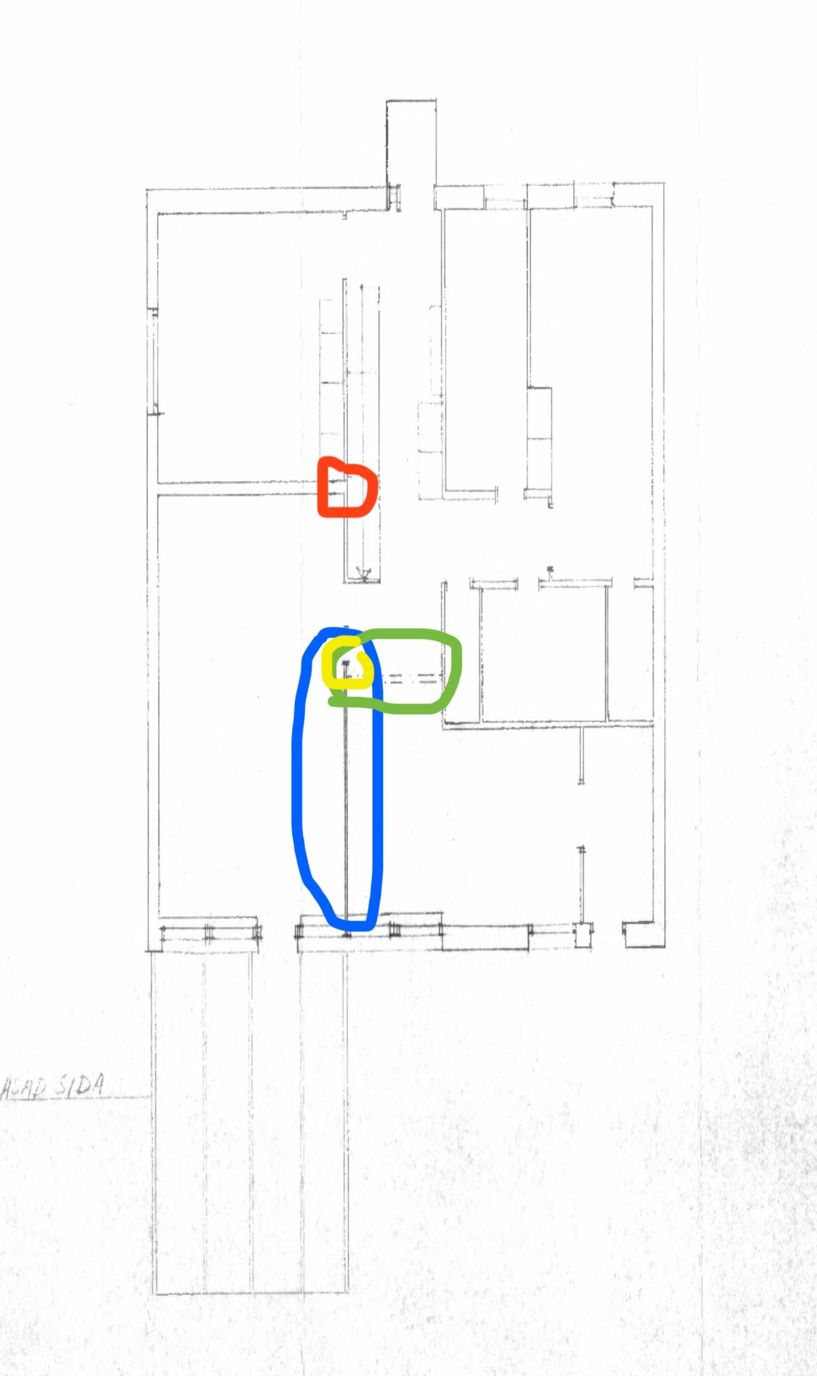 Vi hade velat ta bort både blå och grön, tror ni att någon av dessa är bärande? Blå borde inte vara det då den inte går i takriktningen men kanske grön är? Trots att den är ett valv? Eventuellt man kanske kan ta bort blå och endast ha en pelare kvar vid gul? Men är det troligt att det är bärande vägg/pelare i gul när röd absolut är en bärande punkt?