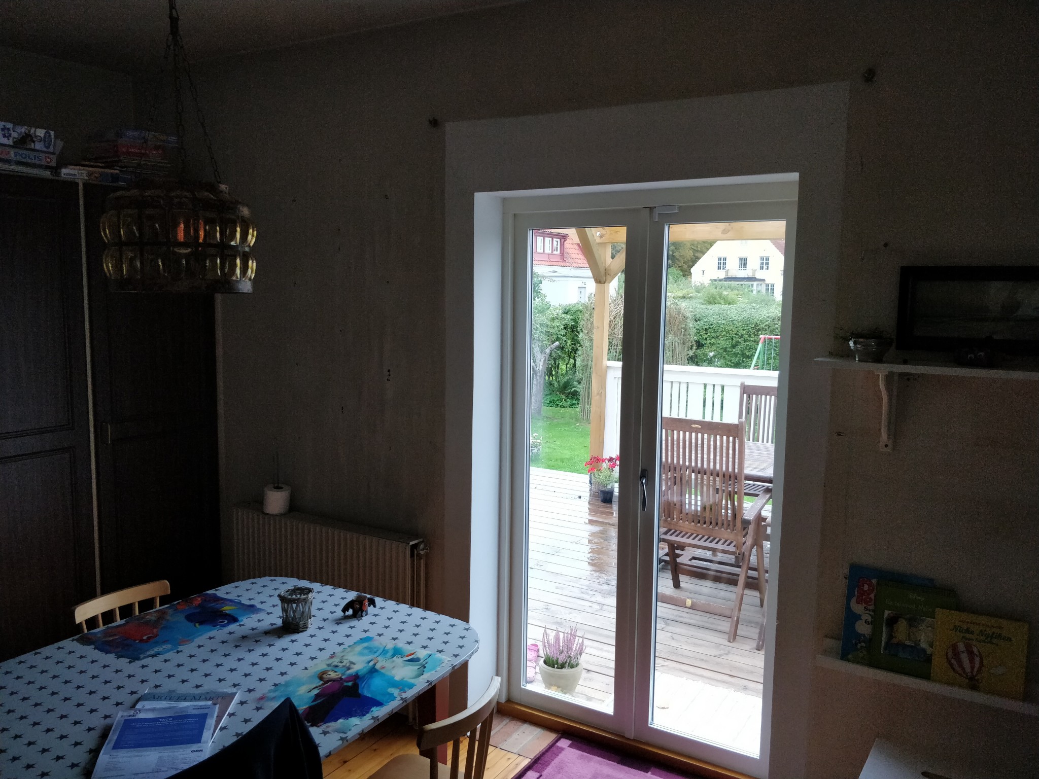 upp utgången från köket till trädäcket och montera ett fönsterparti troligtvis ett skjutbart dito.