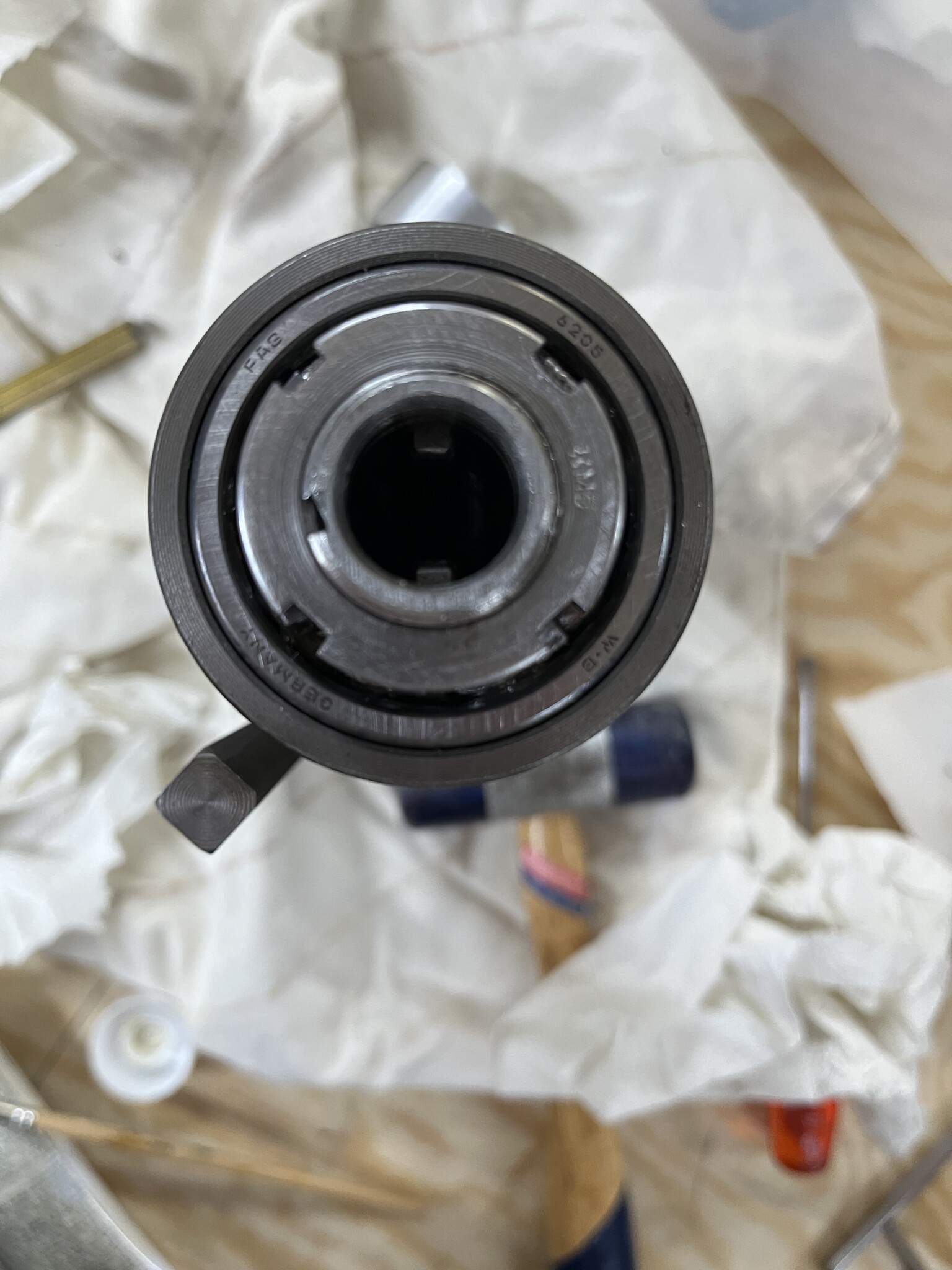 Liten uppdatering. Efter att ha gjort om operationen med spindelhylsa och spindel några gånger för justeringar har jag förstått varför den inte gick att montera tillbaka tidigare. Det var alltså inte på grund av smörjning. Det är ju som sagt två kilar på spindeln som ska passa i två spår på drivaxeln.