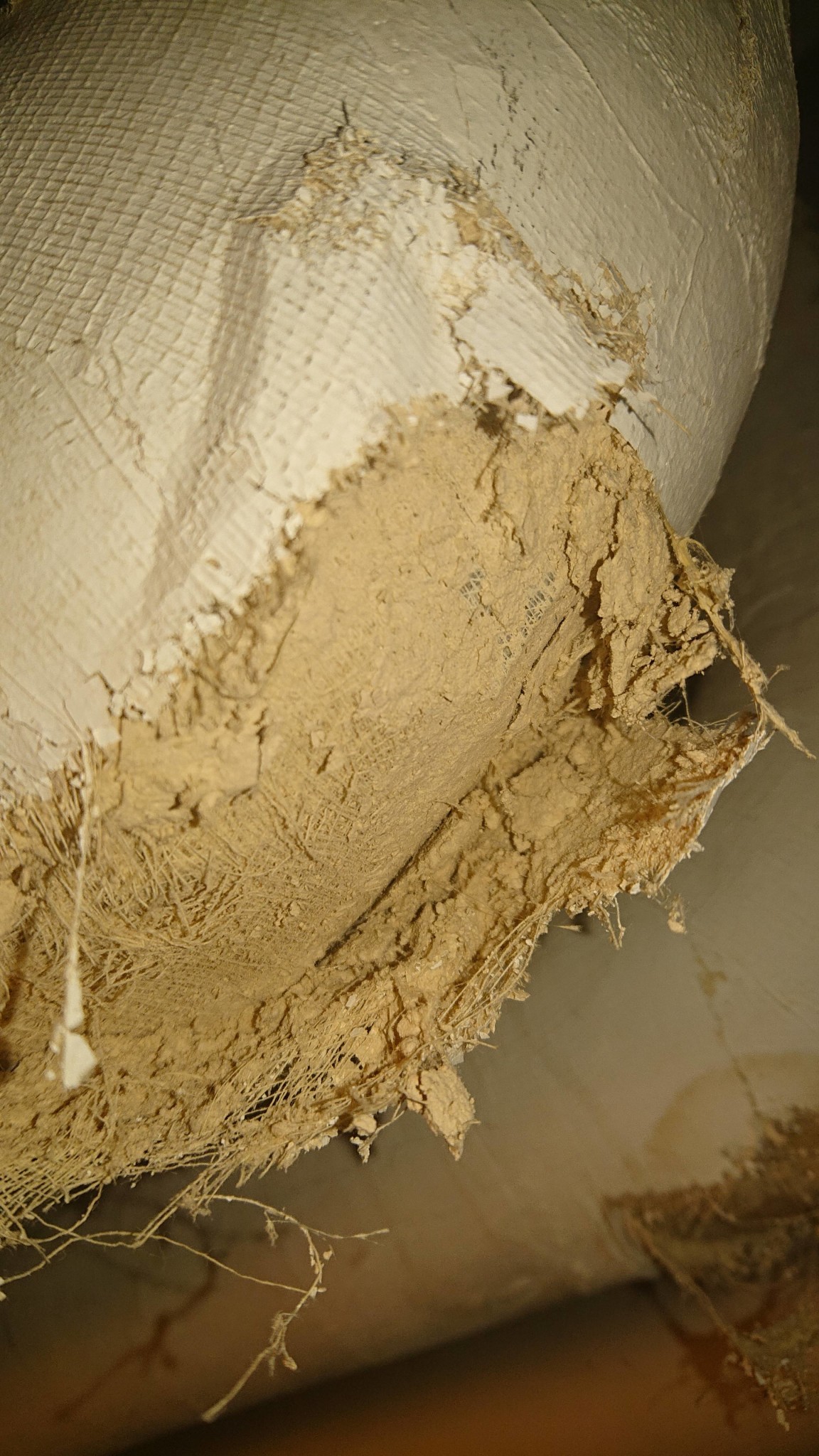 För mig ser materialet likadant ut, både på böjar och raksträckan. Har jag sett fel, och det inte är pappliknande material även i böjarna, utan den underliggande gipsasbestblandningen som kommer i dager, är det en annan sak. Isåfall, är det som sagt var bara att tejpa igen de skadade partierna.