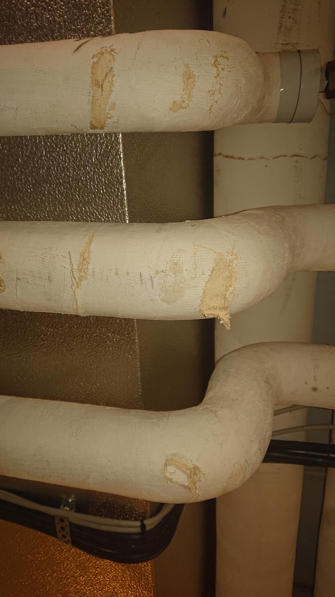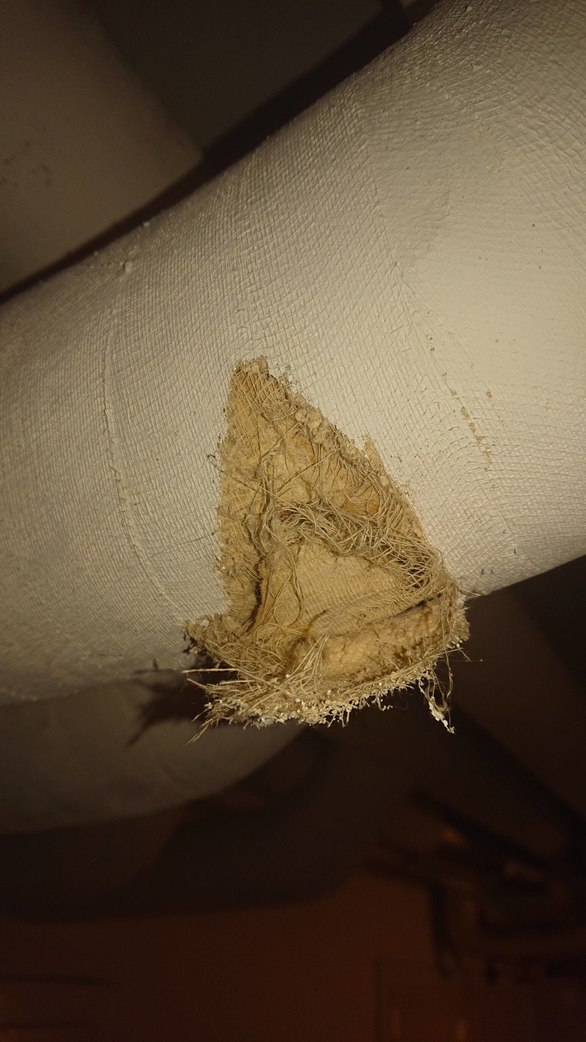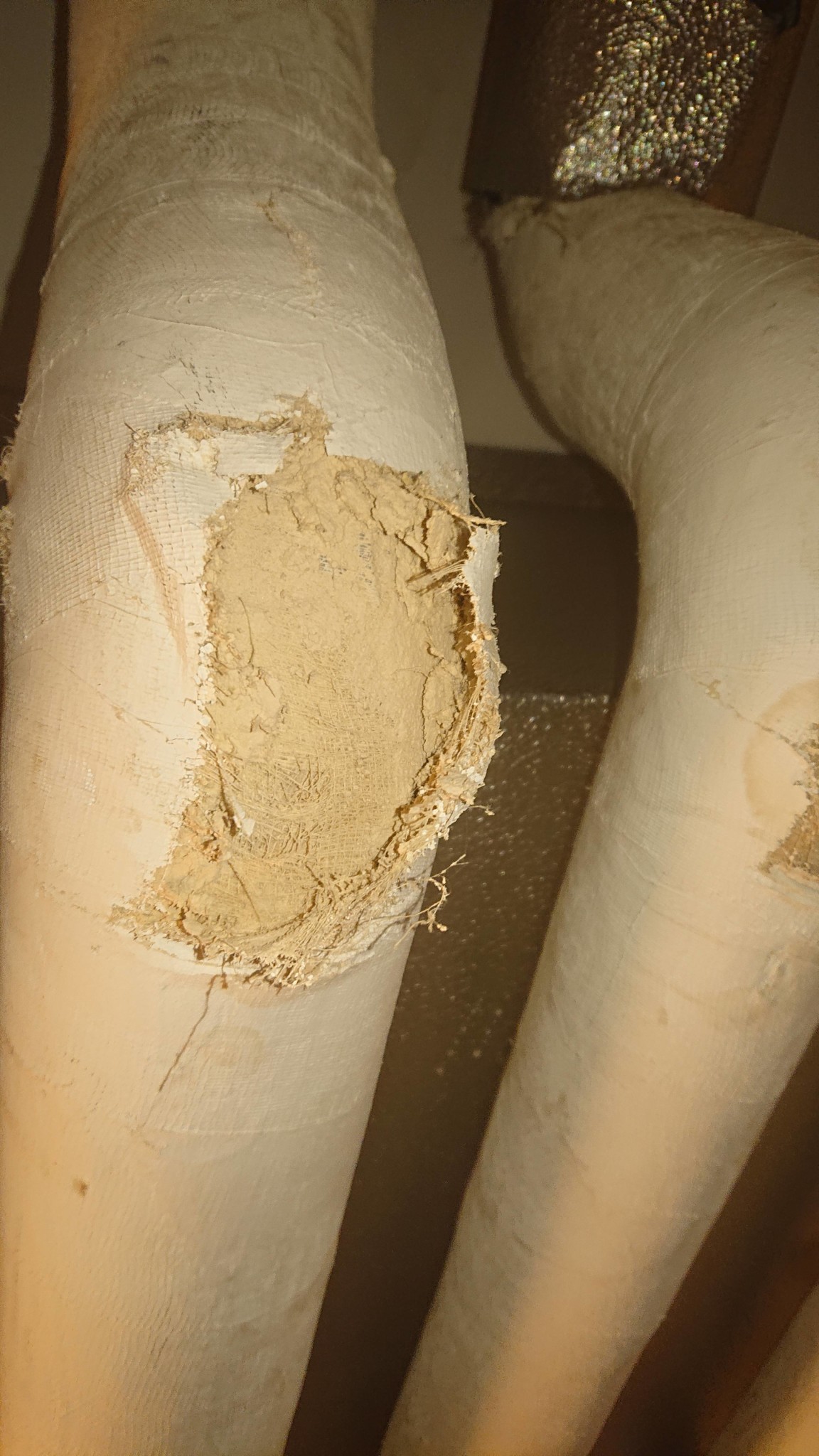 Som du ser är det samma färg på alla skador. Även på den raka delen som vi är överens om, inte innehåller asbest. Till skillnad mot nu, var rörläggarna förr betydligt skickligare yrkesmän, men någon färgmatchning av isoleringen, sysslade de troligtvis inte med. Under den blottade pappen i böjarna är det mycket troligt asbest. Men det är en annan femma, och inget TS. behöver bry sig om.