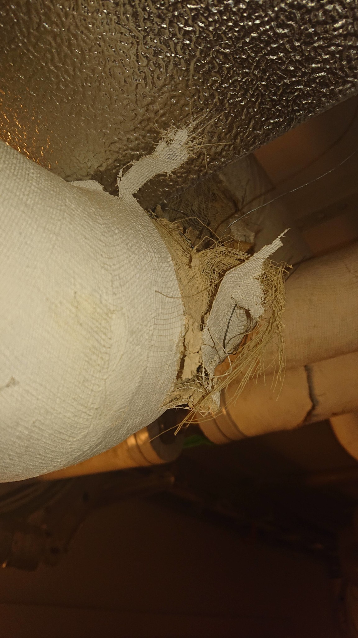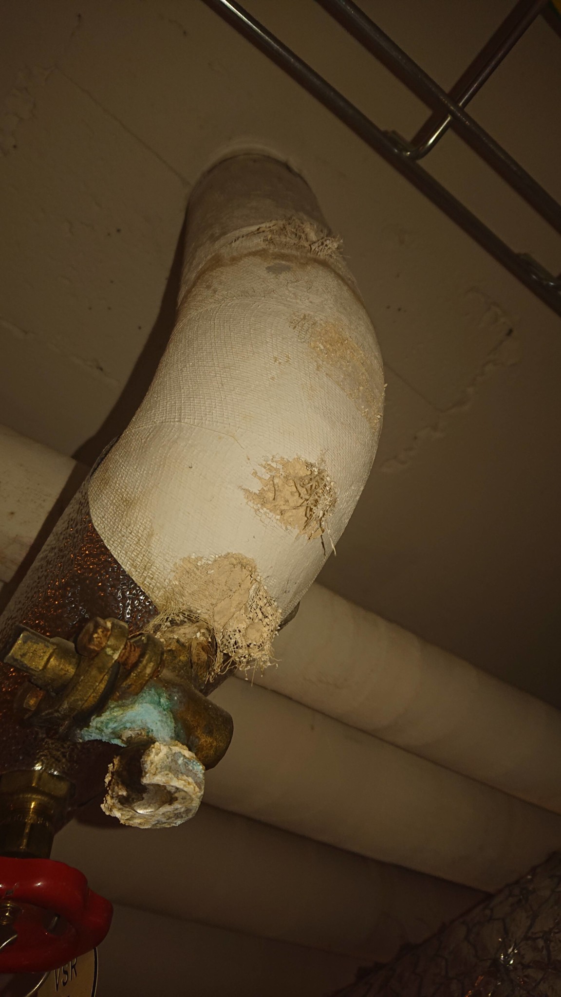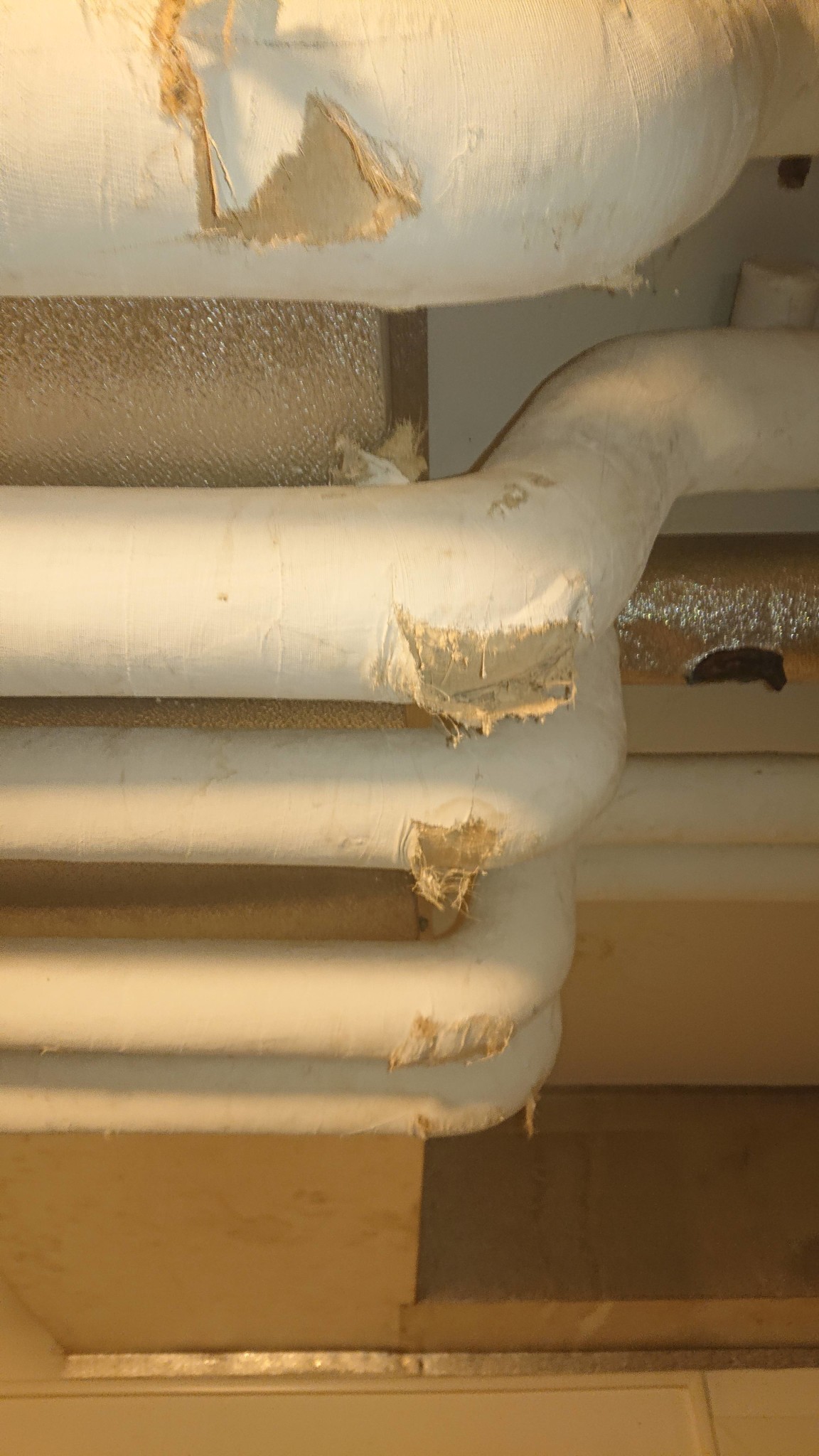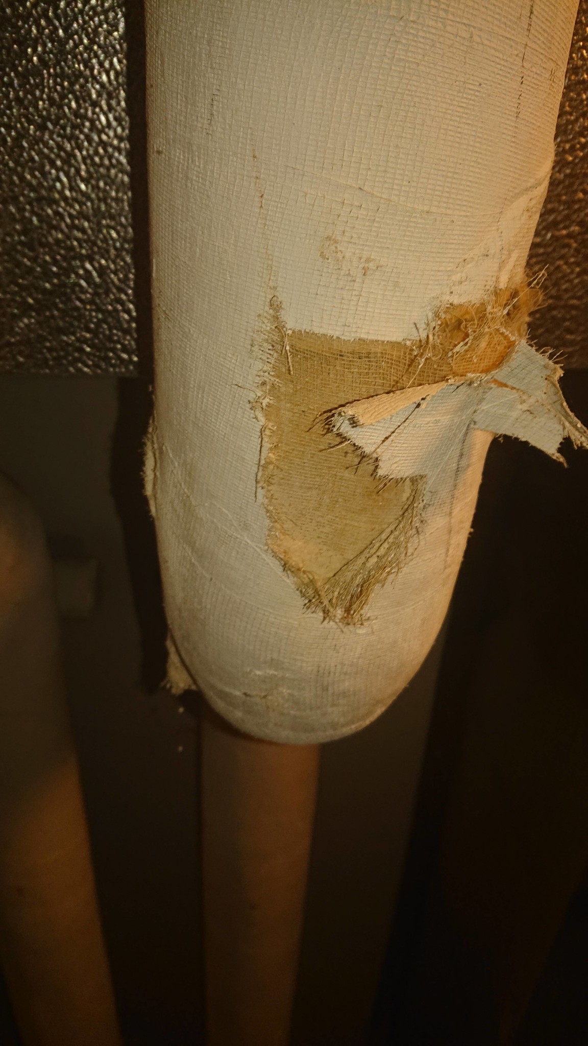 Som du ser är det samma färg på alla skador. Även på den raka delen som vi är överens om, inte innehåller asbest. Till skillnad mot nu, var rörläggarna förr betydligt skickligare yrkesmän, men någon färgmatchning av isoleringen, sysslade de troligtvis inte med. Under den blottade pappen i böjarna är det mycket troligt asbest. Men det är en annan femma, och inget TS. behöver bry sig om.